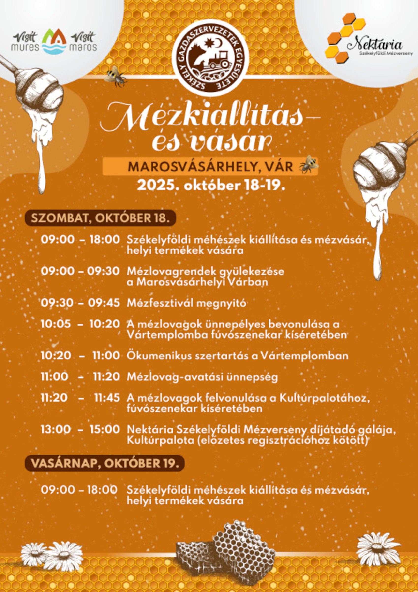 A szombati programban izgalmas foglalkozások mellett mézlovagavatás is szerepel: magyarországi mézlovagok és a mézkirálynő jelenlétében avatnak új lovagokat a marosvásárhelyi Vártemplomban, majd zenés felvonulással vonulnak végig a városon. Az esemény ideje alatt természetesen mézkóstolóban is részesülhetnek a jelenlévők.