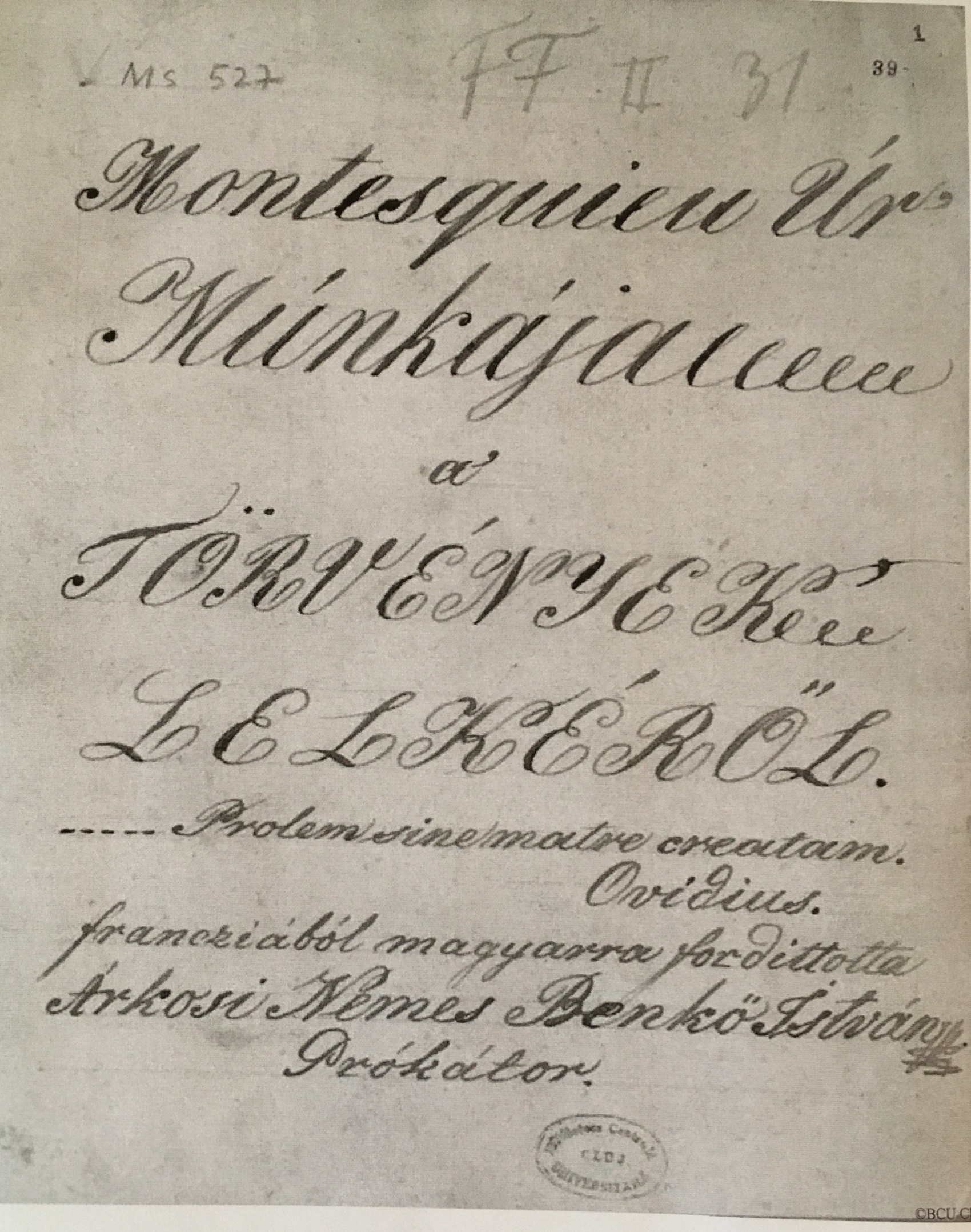 A szakirodalom mindeddig nem beszélt a székelyföldi árkosi születésű Benkő István (sz. 1778) kéziratban maradt tolmácsolásáról. Kéziratban maradt, de a fordító gondoskodott arról, hogy megismertesse Erdély legfontosabb személyiségeivel, azokkal, akik Erdély fővárosában, Kolozsváron építettek maguknak házat, palotát, azokkal, akiknek Erdély gazdasági, politikai, kulturális életében jelentősebb szerepük volt. Az Amerikából hazatérő Bölöni Farkas Sándor (1795–1842) kezdeményezésére, Wesselényi Miklós támogatásával, nyugati modell szerint,4 gróf Béldi Ferenccel, gróf Kendeffy Ádámmal és társaikkal megalapították 1833. január 13-án a Kolozsvári Casinót (Deák Ferenc utca 16., jelenleg Bul. Eroilor), elsősorban a nemesi és a főnemesi osztály számára. A főúri személyek közül, akik látogatták, látogathatták ezt a kaszinót, nem hagyhatók ki a Bánffy, Barcsay, Jósika, Kemény, Mikó, Radák, Rédhey, Szentkereszty stb. családok személyei. De a polgárság sorait sem zárták ki.5 Benkő István ügyvéd, mert ügyvéd (prókátor) volt, „kir. táblai hites ügyvéd”, aki a neve elé nem a középajtai6, hanem mindig az árkosi helységnevet jelölte meg, Montesquieu lefordított könyvének fejezeteit a Kolozsvári Casinónak adományozta, ahol a főúri és polgári személyek 35 újság hírei mellett Benkő István fordítását is olvashatták.7 Egy ilyen kiadványt nem nézhetett jó szemmel I. Ferenc (1768–1835) osztrák császár, magyar király, akárcsak a XVIII. századi francia királyok, akik a hatalomgyakorlás minden formája fölött rendelkeztek. Nem véletlen az, hogy az 1830-as kiadást is névtelenül adták ki, viszont a reformkorban már sokan dacoltak az önkényuralmi rendszerrel, bátran vállalták nevük leírását egy lázítónak tartott könyv elé. Közéjük tartozott Benkő István is, aki Benkő József (1720–1814) tudós professzor egyik tanítványa volt, és aki hálából megírta és 1822-ben kiadta tanára életrajzát.8 Ügyvédi tevékenységének munkahelyét egyelőre csak feltételezzük: Székelyföld és Kolozsvár lehetett.
