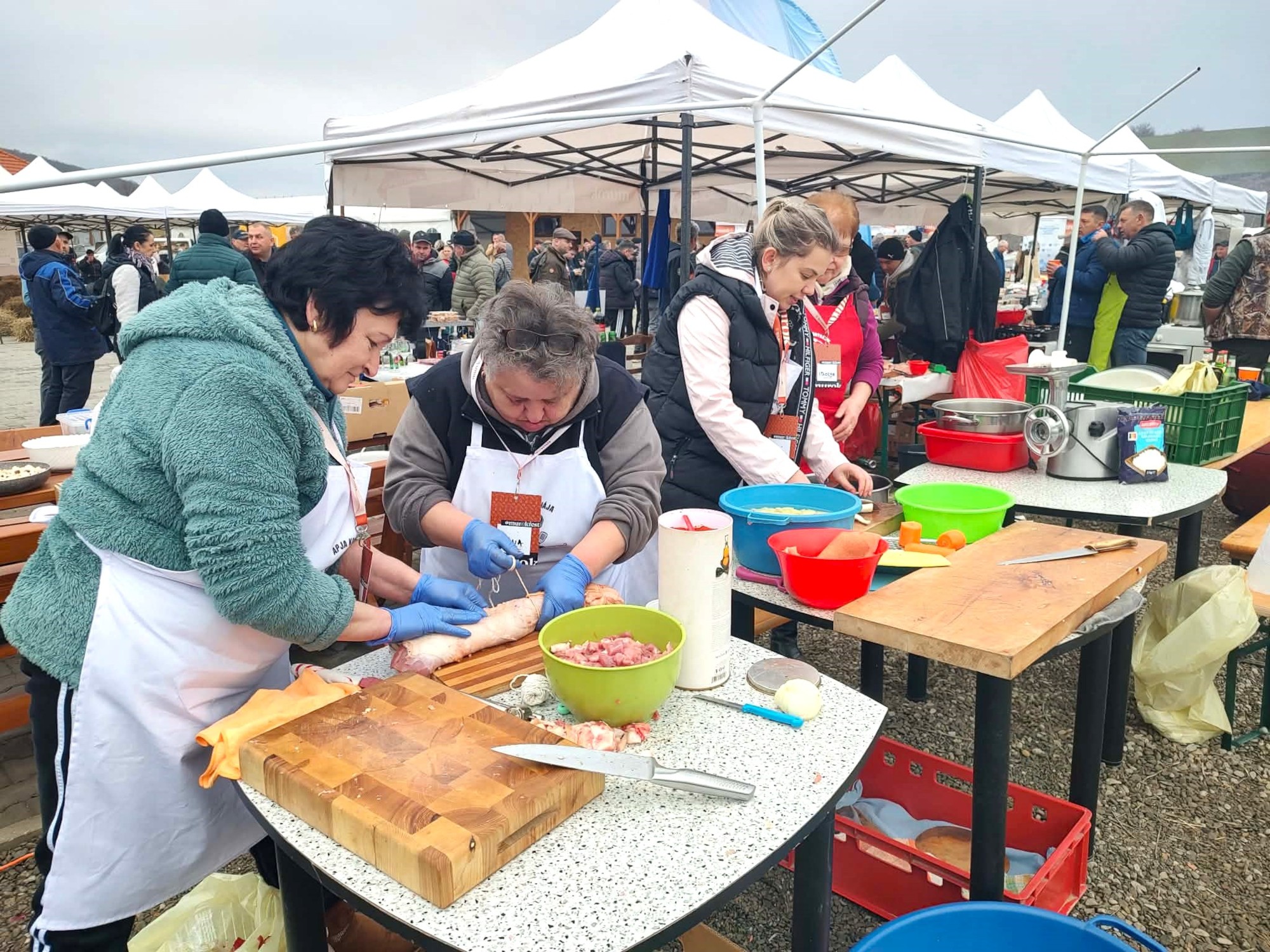 Alig virradt még, amikor a benevezett disznóvágó csapatok megérkeztek a helyszínre, és elkezdték felszerelni sátraikat, felállították üstjeiket, sütőiket, fát hasogattak, felsorakoztatták az asztalon a különböző vágó- és feldolgozó szerszámokat, eszközöket, hogy mire a disznók megérkeznek, minden készen álljon. Mivel a sertések a vártnál később érkeztek meg, jutott idő az asztalok megterítésére, kidíszítésére és falatozásra, a reggeli hideg és a „szorongás” leküzdésére pedig előkerültek a fogópálinkás poharak is, és volt olyan csapat is, amelyik hamarabb tett forralni a tűzre bort, mint vizet. Reggel nyolc órára munkára és versenyre kész volt a köténybe, kuktasapkába öltözött nyolc benevező csapat: a demeterfalvi Retkesek, a szovátai City ITP, a marosvásárhelyi Transilvania Repülőtér, az ákosfalvi helyi tanács és barátai, Karácsonfalva, a marosvásárhelyi InstGaz, a holtmarosi Kemény legények és a nyárádszeredai Apja konyhája.