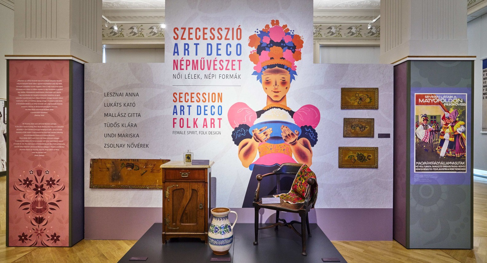 A kiállítás a huszadik század elejének két nagy stílusa – a szecesszió, illetve az art deco – és a népművészet találkozását vizsgálja női alkotók sajátos perspektívájából. Olyan meghatározó női művészek nézőpontján keresztül mutatja be a korszakot, mint Lesznai Anna, a Zsolnay nővérek, Mallász Gitta, Undi Mariska, Lukáts Kató vagy Zsindelyné Tüdős Klára, akik mindannyian úttörők voltak a maguk idejében. A tárlat a köz- és magángyűjteményekből kölcsönzött tárgyak mellé a Hagyományok Háza – Magyar Népi Iparművészeti Múzeum tárgyainak bemutatásával új perspektívát kínál a látogatók számára. A kiállítás, amelynek ötletadója és főkurátora dr. Czingel Szilvia, kurátora Üveges Krisztina, június 22-éig látogatható a Hagyományok Háza (Budapest, Corvin tér 8.) nyitvatartási idejében.