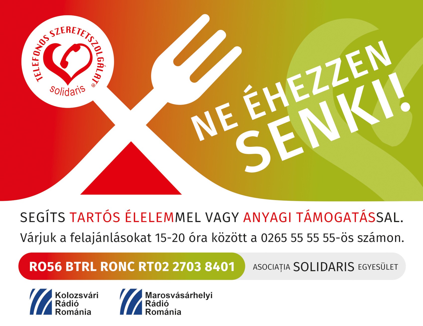 Hétfőtől péntekig 15–20 óra között lehet tárcsázni a 0265-555-555-ös telefonszámot, és jelezni az adományozási szándékot. Aki pénzadománnyal segítene, az Asociaţia Solidaris RO56BTRLRONCRT0227038401 bankszámlaszámára Élelem/alimente megjegyzéssel utalhat valamely összeget. Tartós élelmiszert támogatásként azok kaphatnak, akik lakhellyel rendelkeznek. A felajánlásokat Marosvásárhelyen a Tudor Vladimirescu u. 3. szám alá lehet eljuttatni. A Ne éhezzen senki! kampány célja minél több családot arra ösztönözni, hogy a környezetükben élő nélkülözőkön segítsenek, akár saját maguk állítsanak össze élelmiszercsomagot, hiszen a szegénységet az egymásra figyeléssel lehet hatékonyan csökkenteni.