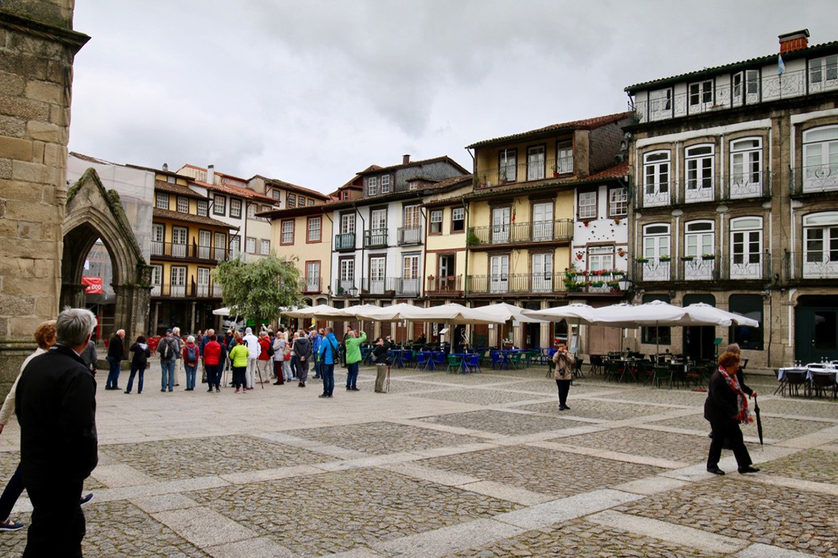 Portóban sok szépet láttunk, még akadna néznivaló, de az időnk véges, a mai útirány Guimaraes, Amarante, Baiao, illetve a Douro Palace szálloda a Douro völgyében. Guimaraes Portótól északra van, Portugália bölcsőjeként tartják számon. Itt született Afonso Henriques, ki Portugália első királyának kiáltatta ki magát 1139-ben, Guimaraes volt az ország első fővárosa. Guimaraes óvárosa ma a világörökség része. Dombos helyen fekszik, keskeny, macskaköves utcáival, régi templomaival, kolostoraival Portugália egyik látogatott helye. Első utunk a történelmi óvárosba, a Santiago térre vezet. Jellegzetes macskaköves tér, az épületek régiek és keskenyek, az ablakok nagy részében virágok. A tér túlsó vége, az Olajfaliget – Largo da Oliveira – egy régi templom, a Nossa Senhora de Oliveira székhelye. Stílusában keveredik a gótikus, bizánci és még ki tudja hány más. Az Afonso Henriques által alapított kolostor helyén van. Előtte egy érdekes, XIV. sz.-i ereklyetartó keresztet őriz. Habár az idő borús, sok a látogató. Kicsi a tér, de nem annyira, hogy ne férne el ott egypár vendéglő, hogy a fáradt turisták megigyanak egy-egy pohár bort, kávét vagy a jellegzetes sütiket kóstolgassák. Nézelődünk, utána találomra bemegyünk az egyik szűk utcába. Emléküzletek, cukrászdák sokasága, s az egyik kirakatban meglátok egy parittyát. Ilyet sem láttam rég, az unokáim fognak örvendeni neki. Az anyjuk azonban valószínűleg kevésbé.