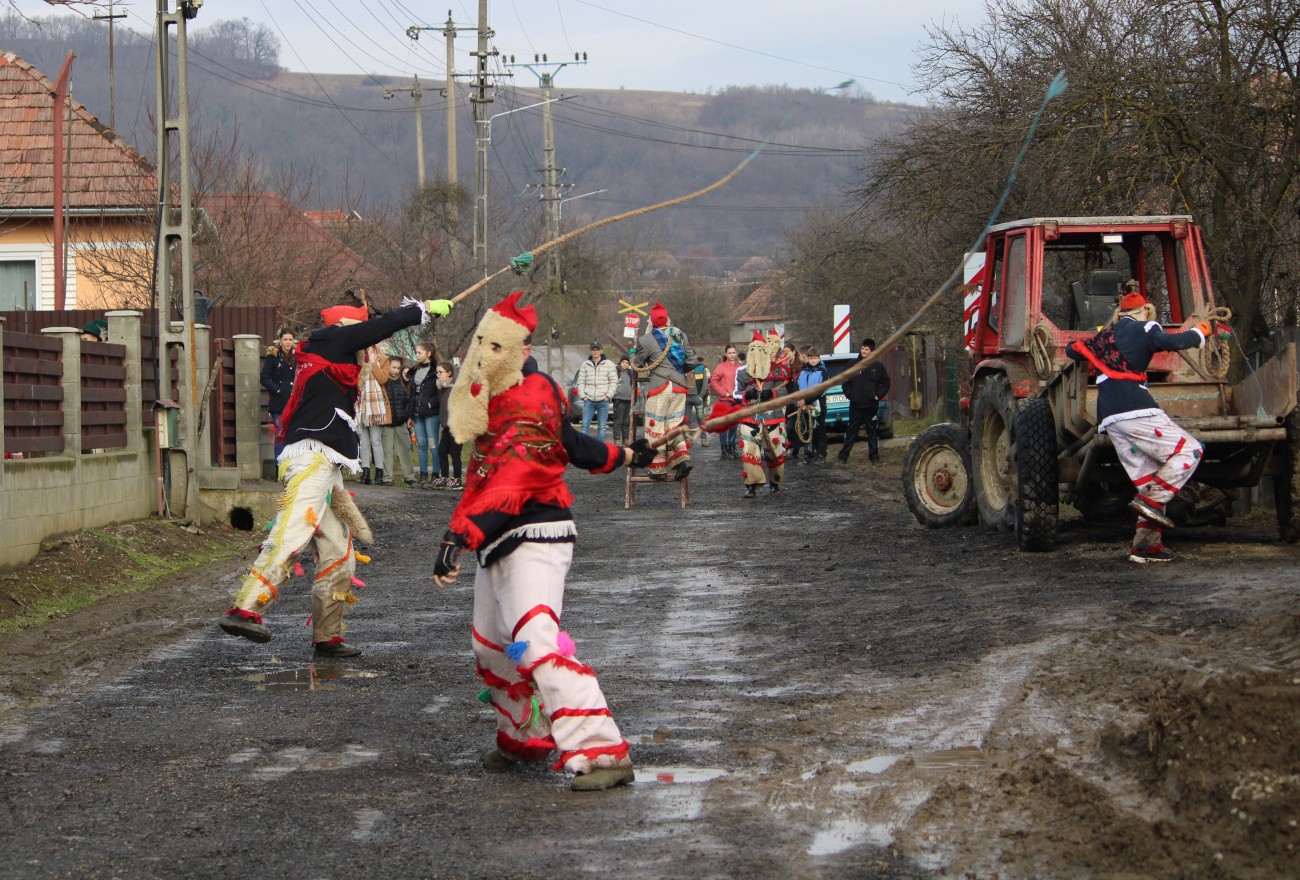 A sokadik célállomásnál az egyik ostoros a háziak létrájával igyekezett kifelé, az út közepére állította fel az emelvényt, majd arra felkapaszkodva a magasból csattogtatott. A szemközti portánál a kapu előtt álló traktort rohamozták meg a farsangolók, a következő pillanatban pedig torkaszakadtából visító, egyik lábán csizmát, másikon csak zoknit viselő lánnyal az ölében szaladt ki egyikük a házból, egyenesen a traktor felé. Néhány perc múlva a fehér bojér az időközben másik csizmáját is felöltő leányzót táncoltatta.