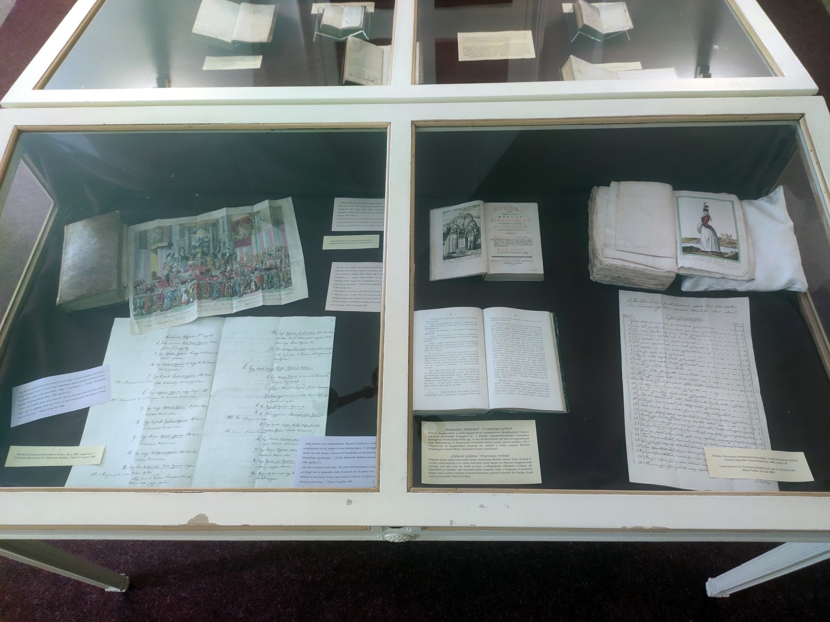 A könyv, amelytől a tárlatvezetés indult, az a zsoltároskönyv volt, amelyet gróf Teleki Sámuel adott ajándékba 1770. december 24-én, házasságuk első karácsonyán „kedves feleségének”, gyöngybetűivel beírt dedikációval. A könyv az első írott jele a kettőjük csodálatos házasságának, amely 27 éven keresztül „az egymásra való odafigyelésről, egymás különböző elképzeléseinek a támogatásáról szólt”. Emellett láthattunk az első tárlóban olyan könyveket, amelyeket a grófnő még nagyszüleitől kapott ajándékba. Bethlen Zsuzsannát ugyanis a nagyszülők nevelték, mivel egyéves volt, amikor meghalt az édesanyja, és édesapja újraházasodott. Nagyanyja, Rhédey Zsuzsanna, akit Erdély egyik legszebb asszonyának tartottak, könyvgyűjteményét halála után unokájára hagyta, és szintén családi adományként került a tulajdonába nagynénje, Wesselényi Kata több mint 300 kötetes könyvtára, amely gyűjteményének az alapját képezte.