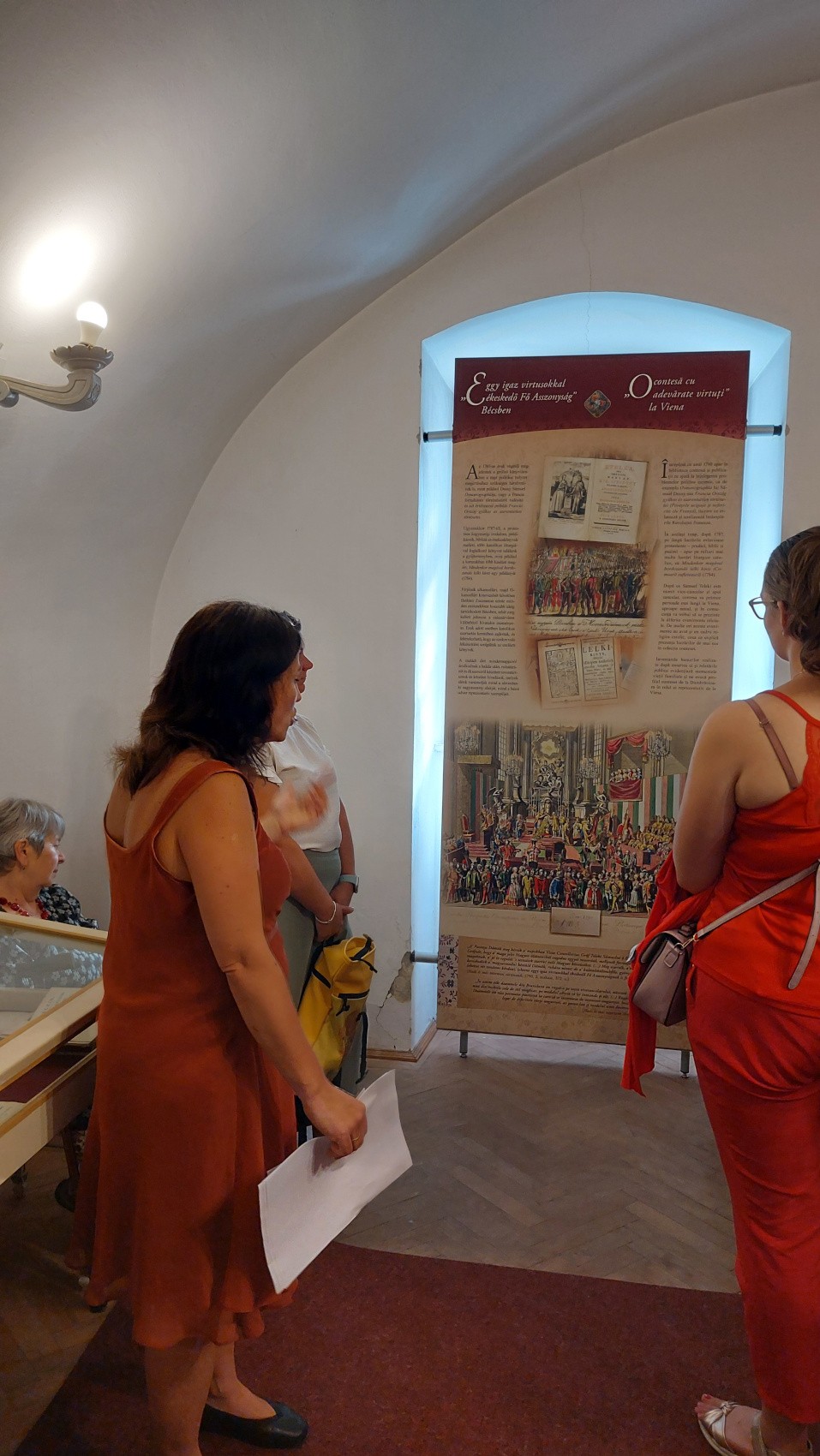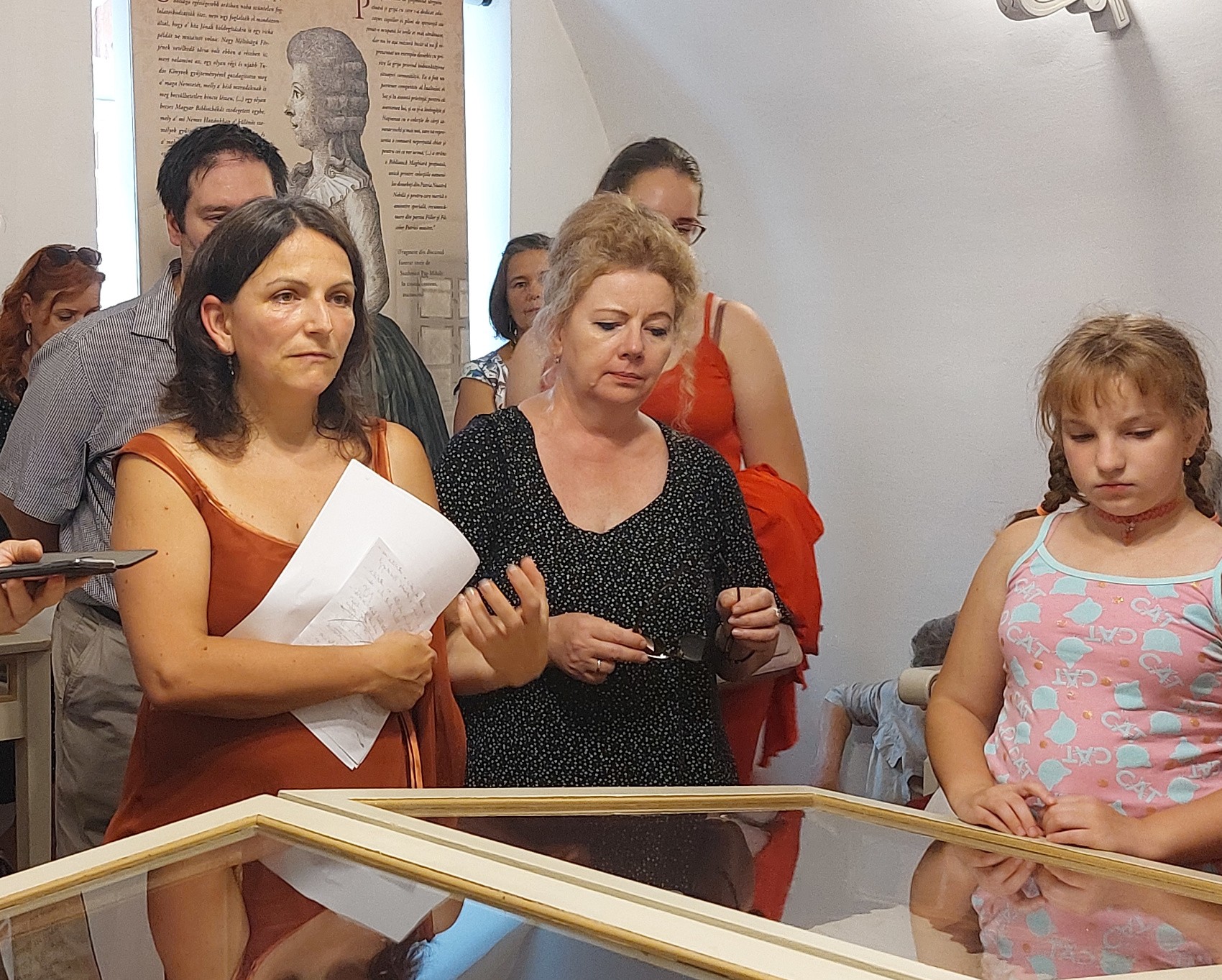 – A mai tárlatvezetés nem a könyvektől indul, nem azt fogom elmondani, hogy a grófnőnek több mint 1200 könyve volt, amelyeket 27 év alatt gyűjtött féltő odaadással, és nem arról fogok beszélni, hogy milyen ritkaságok találhatók a könyvek között… Ez ma nem egy tudományos idegenvezetés lesz, hanem egy pörgősebb, hisz a Forgatag arról szól, hogy megpróbáljuk bepörögni az emberek lelkébe, szívébe a kultúrát, a Tékát, és ezzel is részesévé tenni a vásárhelyieket ennek a helynek, amely mindannyiunké. Ezért a kiállítás kapcsán azokról az érzésekről, élethelyzetekről szeretnék beszéni, amelyek e könyvek mögött léteznek: szenvedélyekről, feladatokról, bánatokról, amelyeket akár mindannyiunk könyvtárát megnézve is felfedezhetünk. Nem hiába mondják, hogy nézd meg az emberek könyvespolcát, és megmondod, milyen ember. Nem volt ez másképpen kétszáz évvel ezelőtt, Bethlen Zsuzsanna esetében sem. A tárlókban kiállított könyvek az ő különböző élethelyzeteinek hű lenyomatai. Ezért lett a mai tárlatvezetés címe Gyermekek, ruhák, könyvek – hangzott el a bevezetőben.