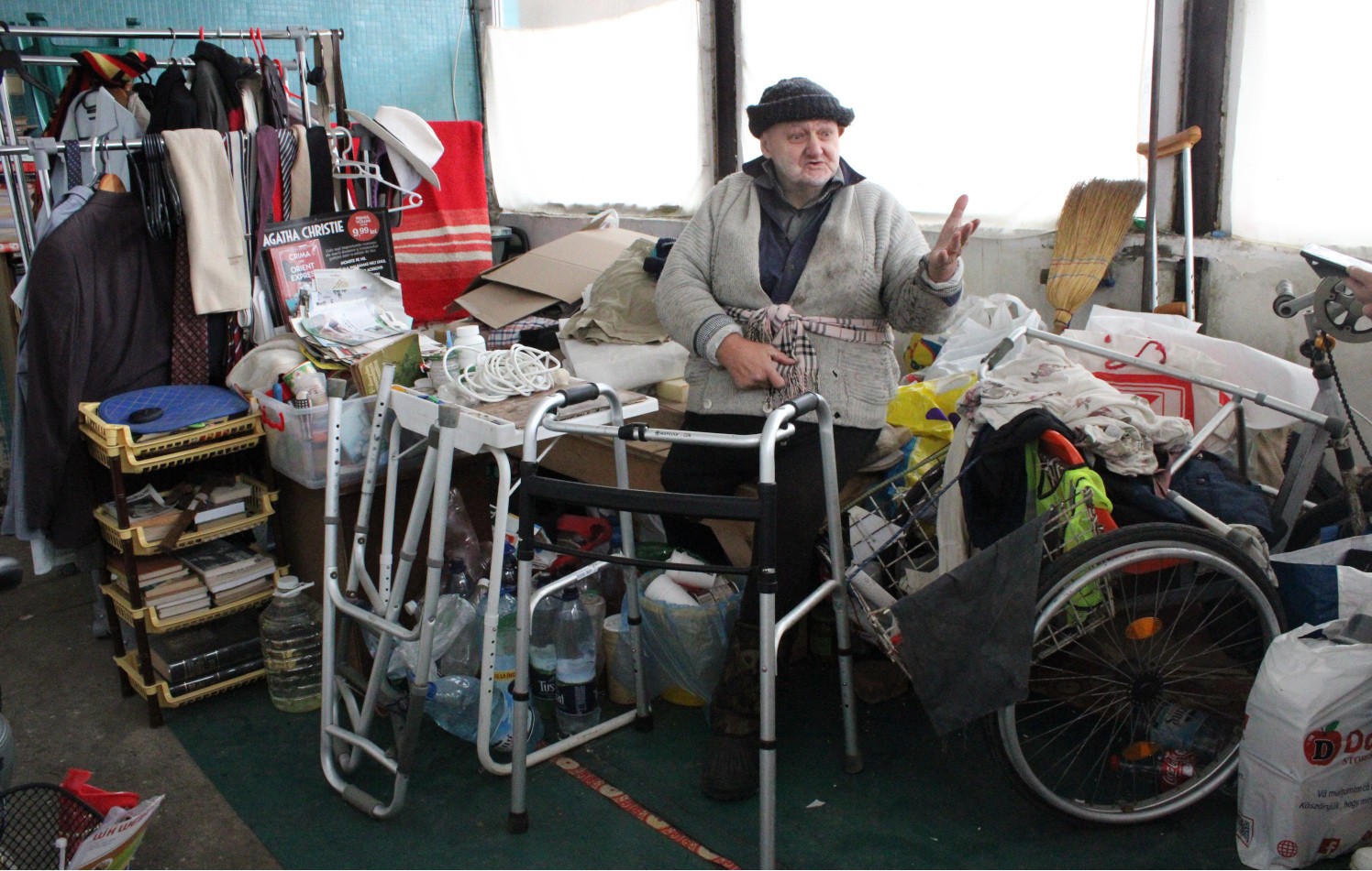 A Kárpátok sétányon meghúzódó egykori kereskedelmi egység bejáratán függöny, az ajtón telefonszám és néhány szó, amelyek szerint a hely eladó. Odabent, a fűtés nélküli térben ruhafogas, rajta egyebek mellett egy érdekes fehér kalap, a fal mellett elektromos robogó, amit a tönkrement akkumulátor miatt már jó ideje nem tudott használni a 73. életévében járó, fél lábát több mint hat éve elvesztett lakó, a helyiség másik felében egy tricikli, ami jó időben megkönnyíti a közlekedést. Becsomagolva egész sor DVD, egy parányi könyvespolcon értékesebbnél értékesebb könyvek, amelyeket a nehéz helyzetben lévő nyugdíjas szívesen értékesítene.