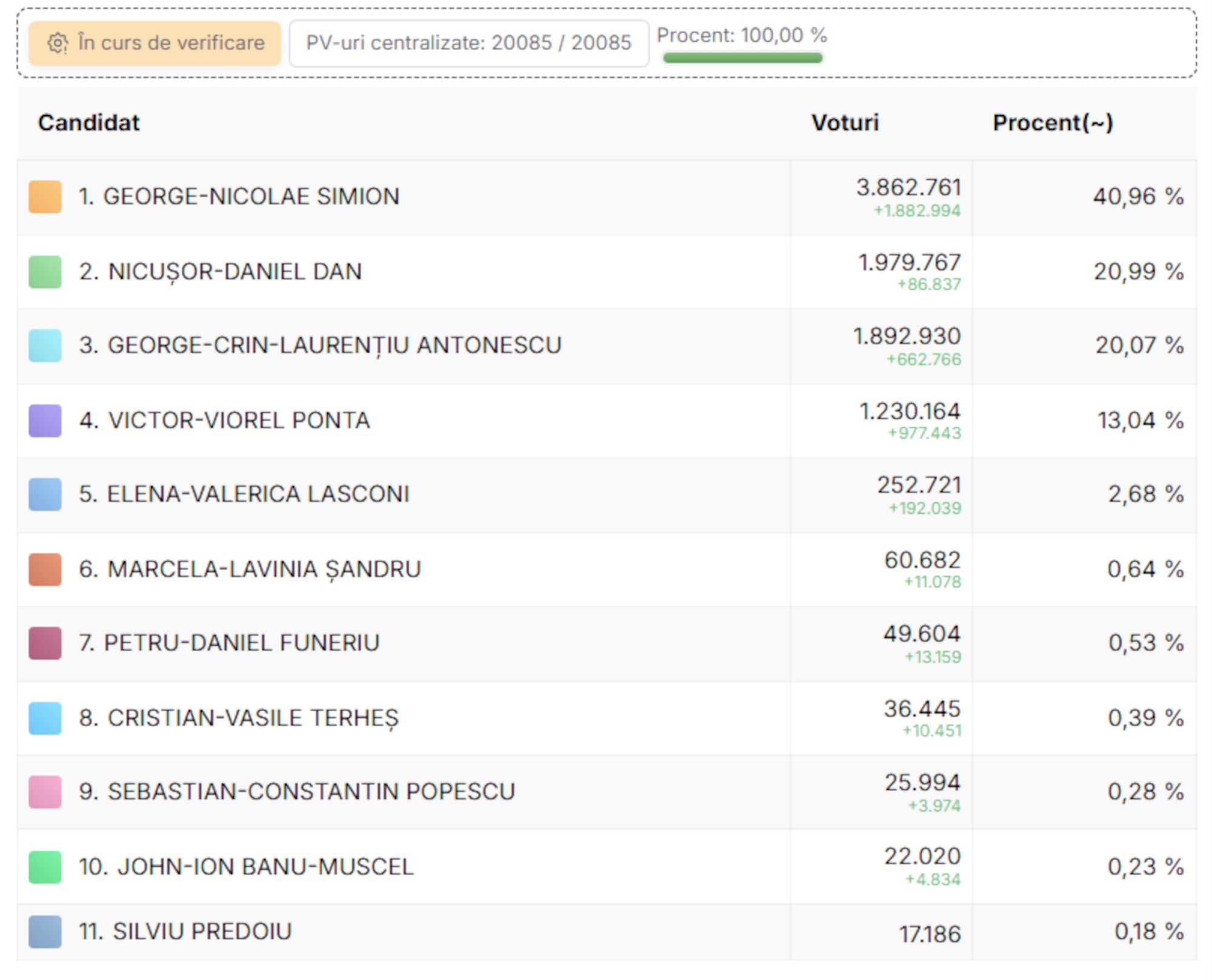 Az országon belül leadott szavazatok 99%-os feldolgozottságánál George Simion a voksok 40,5%-át szerezte meg, Nicușor Dan lett a második 20,88%-kal és Crin Antonescu a harmadik 20,36%-kal. A diaszpóra szavazatainak 89%-os feldolgozottsága mellett Simion majdnem 60%-ot, Nicușor Dan valamivel több mint 26%-ot, míg a koalíció közös államfőjelöltje Crin Antonescu alig több mint 7%-ot kapott. Ezen százalékok már csak minimálisan módosulhatnak a teljes feldolgozottságnál is. Amennyiben változnak is a százalékok, a sorrend nem fog, kijelenthető ehát, hogy a második fordulóban a szélsőjobboldali George Simion fog megmérkőzni Nicușor Dannal. A helyzet pedig nagyon borús, sőt egyenesen félelmetes képet fest!