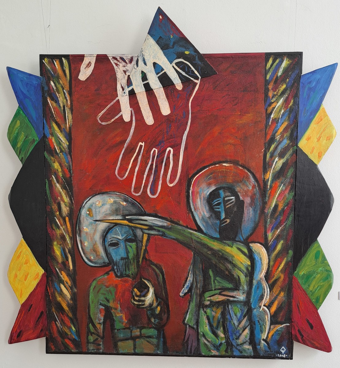 A szülőváros mégiscsak más. Itt 60 évesen is gyermeknek érezheti magát az ember. A nála idősebbek, a szülők nemzedéke magától értetődően az ifjút látják benne, a vele egyívásúk megannyi régi, szép emlékét idézik. És a kiállított alkotások is valahogy jobban azonosíthatók, az azokat alkotó jelek is könnyebben felismerhetők. Akkor is, ha új a sorozat, és a művek nagyobbik hányada eddig még nem is került közönség elé. Úgy képzelem, Simon Zsolt ilyesmit érezhetett a marosvásárhelyi telt ház láttán, ilyen gondolatok ébredhettek benne a sok röpke beszélgetés nyomán, amiket a rokonokkal, barátokkal, kedves ismerősökkel és ismeretlenekkel folytatott a tárlatnyitó előtt és után. Huszonöt munkáját hozta el a Kép-jel című kiállításra, épített képeket, ahogy ő is nevezi művészettörténész méltatója, Szücs György találó névhasználata nyomán. Van olyan, amelyik az útkereső újabb folyamat kezdeti fázisát idézi, a többség már a napjainkban testet öltő alkotói hitvallásának kivetülése. A nagy méretű Életkártya, Város felett, Barokk virág egyértelműbben tükrözi a művész vásárhelyiségét, a Kép – Jel – Rítus és a méretében jóval kisebb Önreflexió (Ön-kép) sorozat a keresés időbeliségét is érzékeltetve döbbenti meg a nézőt, aki azon is morfondírozik, hogyan is születnek ezek a falsíktól elrugaszkodó, rétegzett léclapok közé szorított, mégis szabad szárnyalást sejtető festmények. Simon ezt szóban is kifejtette a festészetét beajánló művészeti író kérdéseire válaszolva.