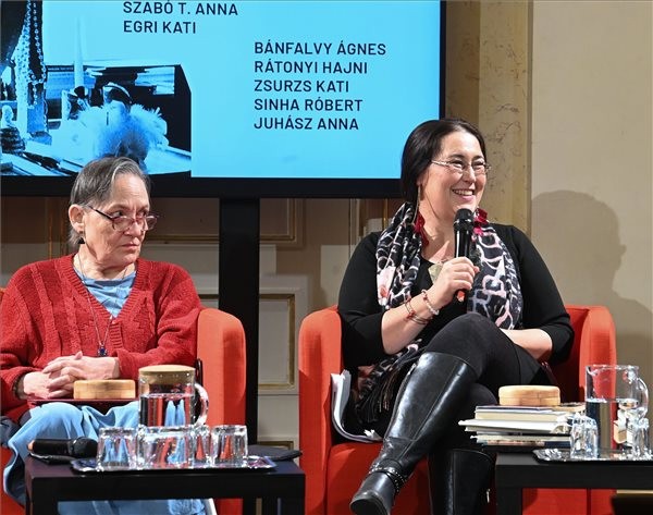 Egri Kati Jászai Mari-díjas színművész (b) és Szabó T. Anna költő, író, miután átvették a Szabó Magda-díjat a Petőfi Irodalmi Múzeum dísztermében tartott ünnepségen 2023. október 4-én. Az irodalmi elismerést Szabó Magda jogörököse, Tasi Géza alapította. A Kossuth- és kétszeres József Attila-díjas íróról elnevezett díjat első alkalommal adták át