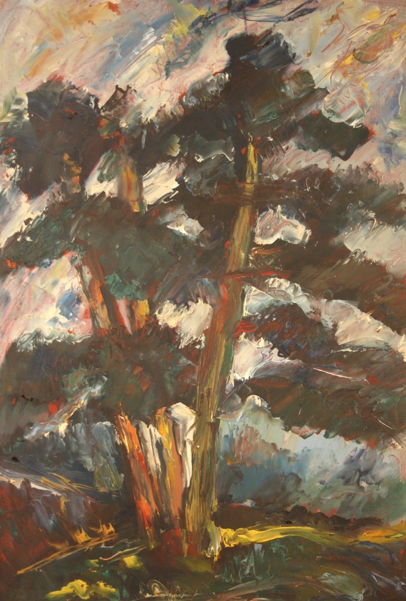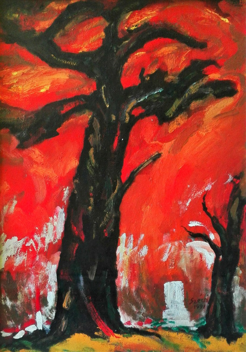 Egy másik, gyakran felbukkanó témája Szécsinek: a fák. Vagy csoportosan, 3-4 darab lombos fát (Erdőszéle, Fenyők, Fák I), vagy egy-két lecsupaszított, lomb nélküli fát fest (Tél, Erdélyi táj, Fák II). A magányos fa (ember) sokkal kiszolgáltatottabb, sebezhetőbb, mint a csoportban/családban élők. Elég, ha az itt kiállított Fák II című képét említem, melyen egy kiégett, csupasz fát látunk. A létéért, a megmaradásért küzd, még ha ez reménytelen is. Erre illik igazán Sütő András jelzője: a keserű szemű festő! És ugyanúgy a konok jelző is, mert konokul kitartott szülőföldje mellett.