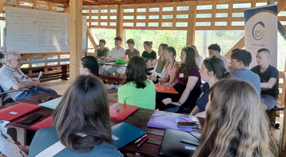 Ösztöndíjasok a Nyilas Misi Egyesület nyári táborában Péntek János elnökkel