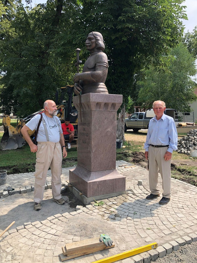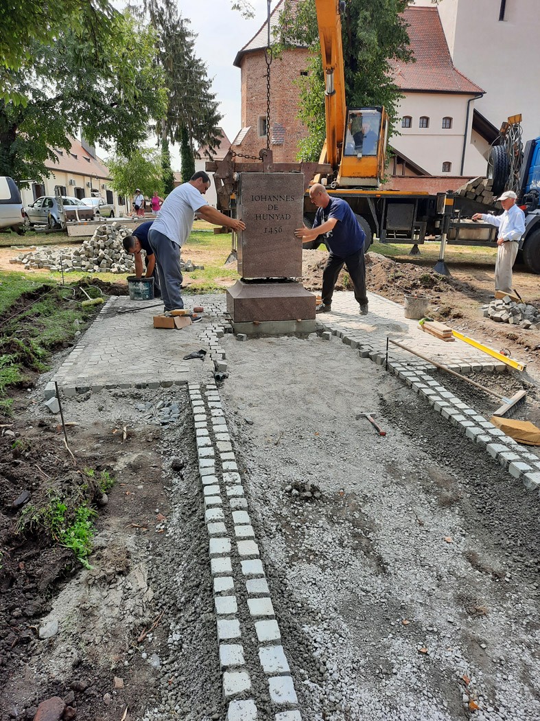 Csütörtök reggel érkezett Szovátáról Marosvásárhelyre a köztéri emlékmű alkotója, Bocskay Vince szobrászművész, bronzba öntője, Sánta Csaba szobrászművész és a zsögödi andezitből készült talapzat kivitelezője, Dóczy András szobrászművész Csíkszeredából, valamint a munkálatukhoz nélkülözhetetlen csapatuk. A várban a július 30-án 12 órára tervezett avatóünnepség színhelyén, a templom és a megyei múzeum székhelye közti zöldövezetben már várták őket a helyi szakemberek. Operatív, olajozottan működő munka kezdődött. Mire a déli harangszó megszólalt, a három részből összeálló talapzat kétharmada talpon állt. Rajta a nagy történelmi személyiség latin neve: Johannes de Hunyad, illetve a hátoldalon az adományozó Professzorok Batthyány Körét megörökítő kétnyelvű felirat. Az 1456-os nándorfehérvári győzelem hős vezérének erőt sugárzó bronzmása még a terepjáró platóján nyugodott, de egy jó óra teltével akár fel is lehetett volna avatni az oda illő impozáns, új emlékművet.