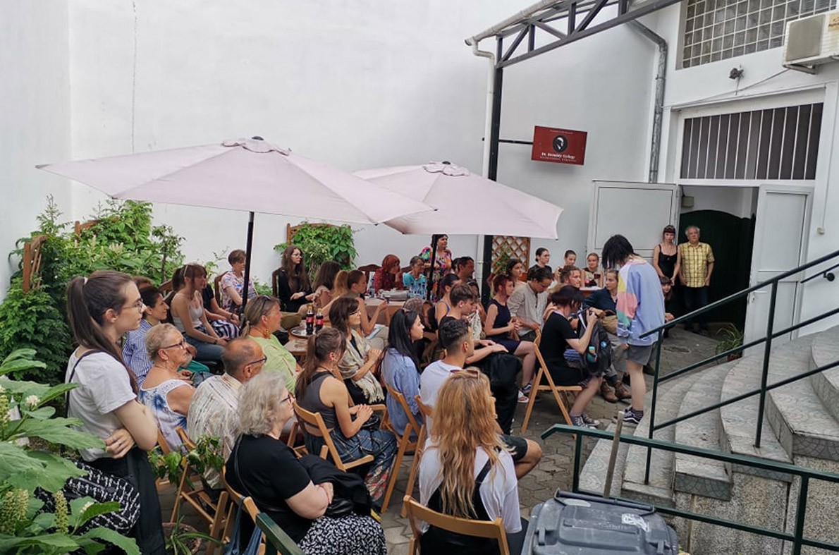 A tárlatnyitó résztvevői a Bernády Ház udvarán
