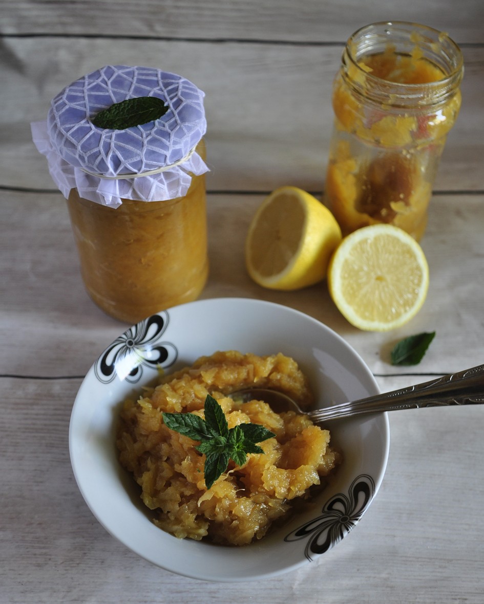 Hozzávalók: 2 kg tökhús, 4 kezeletlen héjú citrom, 3-4 friss vagy szárított mentaszár, 80 dkg – 1 kg cukor, víz.