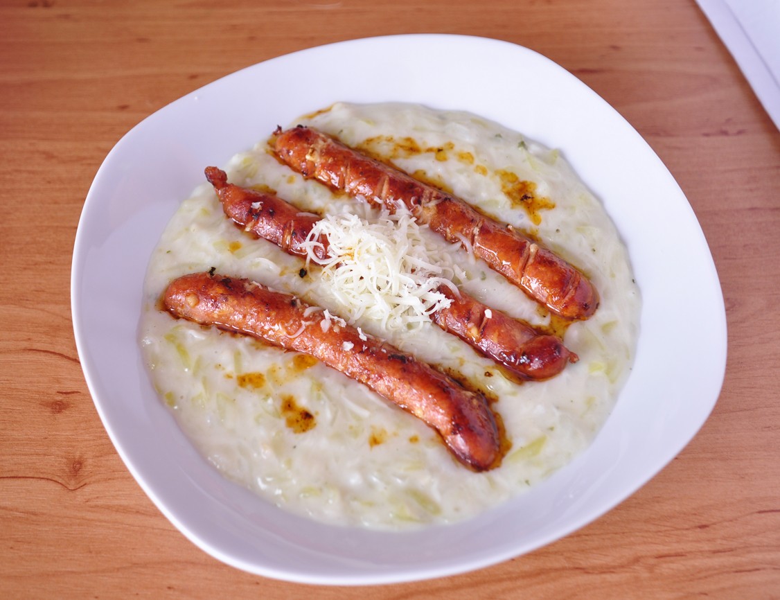 Hozzávalók 4 személyre: 1-1,2 kg főzőtök, 2 hagyma, 5-6 cikk fokhagyma, 2 csapott evőkanál liszt, 2-3 dl tejszín, 25 dkg sajt, 8-12 szál vékony kolbász, olaj, esetleg kapor, só, bors.
