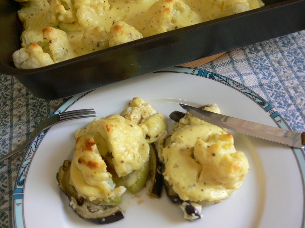 A mártáshoz felforrósítjuk az olajat, rászórjuk a lisztet, elkavarjuk, majd felöntjük 2-3 dl hideg tejjel, és simára kavarjuk. Ekkor félrevesszük a lángról, egyenként hozzákeverjük a tojásokat (a másodikat csak akkor, amikor az elsőt már jól elkavartuk), majd felöntjük a maradék tejjel és a tejszínnel. Néhány percig forraljuk, közben sózzuk, illetve ízesítjük durvára tört zöld borssal és őrölt szerecsendióval, esetleg citromlével, végül pedig belekeverjük a lereszelt sajtot, és jól eldolgozzuk benne. Kivesszük a sütőből a tökös-padlizsános tálat, a karfiolrózsákat szétosztjuk a tökszeletek tetején, és az egészet bevonjuk az elkészített mártással. 10-15 percre visszatoljuk a sütőbe, míg a mártás teteje szép aranysárgára nem pirul. Önmagában vagy húsok mellé köretként is fogyaszthatjuk.