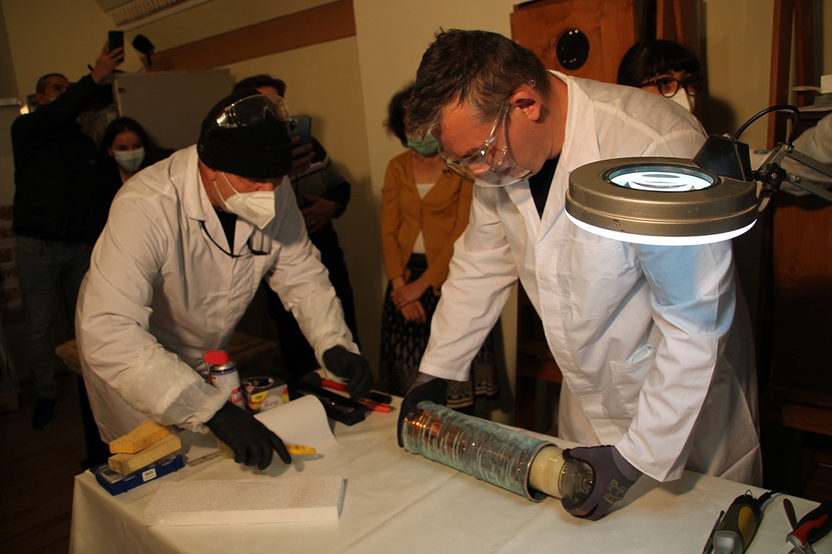 Történelmi eseménynek lehettek szem- és fültanúi mindazok, akik ellátogattak hétfő délután a Maros Megyei Múzeum várbeli épületébe, illetve azok is, akik élőben követték az eseményt az Erdélyi Református Egyházkerület Facebook-oldalán, amikor is kibontották a marosvásárhelyi Református Kollégium alapkövébe zárt időkapszulát. Amint arról korábban is írtunk, az alapkövet múlt héten, a felújítási munkálatok során véletlenül találták meg, és az Erdélyi Református Egyházkerület kérésére a Maros Megyei Múzeum régészeinek felügyelete mellett emelték ki. Az 1 méter hosszú, 80 cm széles és 60 cm magas alapkő magyarvistai fehér homokkőből készült szecessziós stílusban, és jó állapotban maradt fenn. A múzeum munkatársai pontosan tudták, hogy mi rejtőzik a szarkofághoz hasonlatos alapkőben, ennek ellenére a résztvevők szinte lélegzet-visszafojtva várták, hogy mi kerül elő belőle.