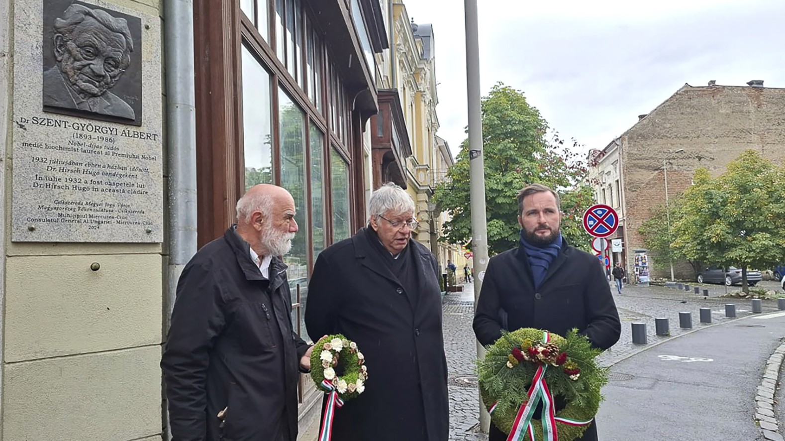 Koszorúzás Csíkszeredában, a Szent-Györgyi Albert-emléktáblánál. A képen a cikk írója, Gazda István tudománytörténész és Percze László, Magyarország Csíkszeredai Főkonzulátusának konzulja
