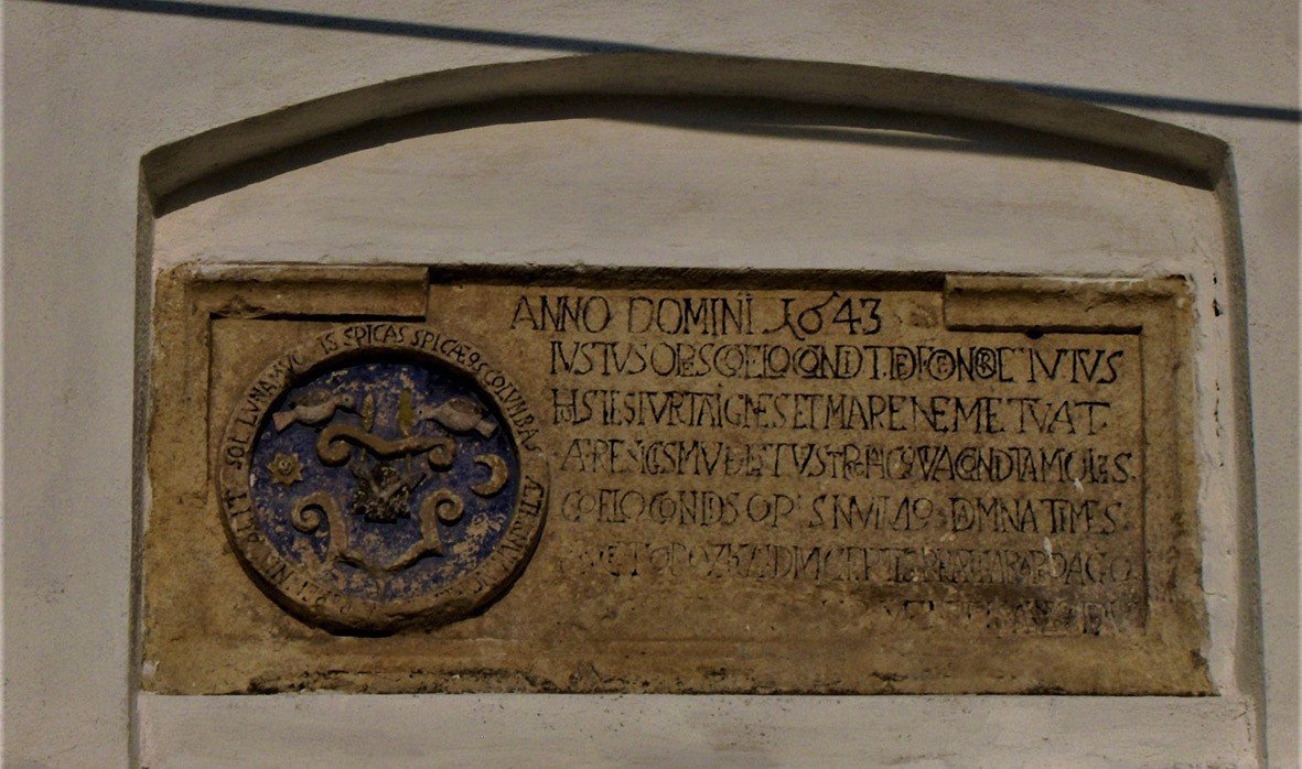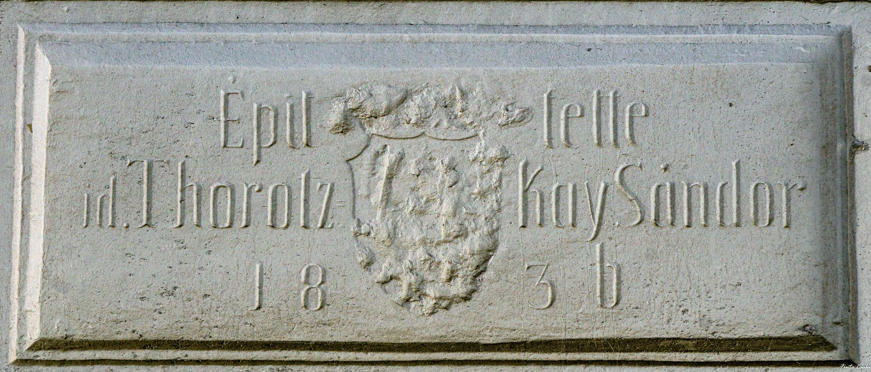 Mivel az építtető a nemesi ághoz tartozott, feltételezzük, hogy az emléktábla közepét díszítő, erősen megrongálódott címer a család nemesi címere lehetett.