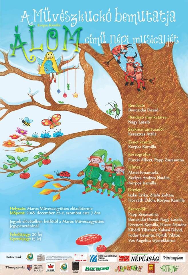 A Művészkuckó újabb produkcióval lepi meg a közönségét, ezúttal Korpos Kamilla Álom című népi musicaljének bemutatójára kerül sor Bonczidai Dezső rendezésében, december 22-én, szombaton este 7 órakor. Az Álom című előadás egy olyan világot jelenít meg, mely mindannyiunk szívében ott dereng.