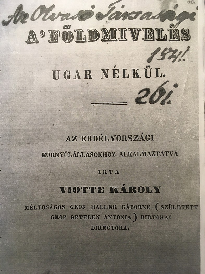 3. A földművelés ugar nélkül. Az erdélyországi kötnyűlállásokhoz alkalmaztatva írta Viotte Károly méltóságos gróf Haller Gáborné(született gróf Bethlen Antónia) birtokainak directora. Nagyszeben, 1841.