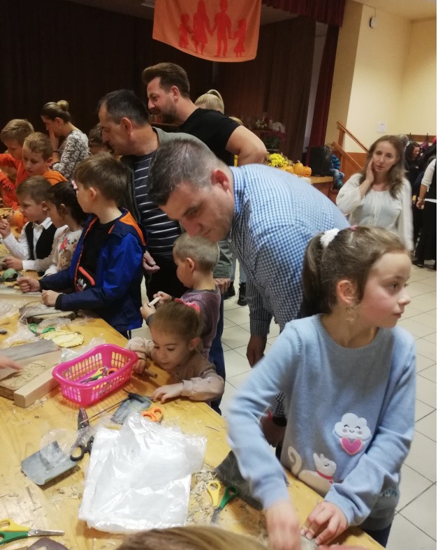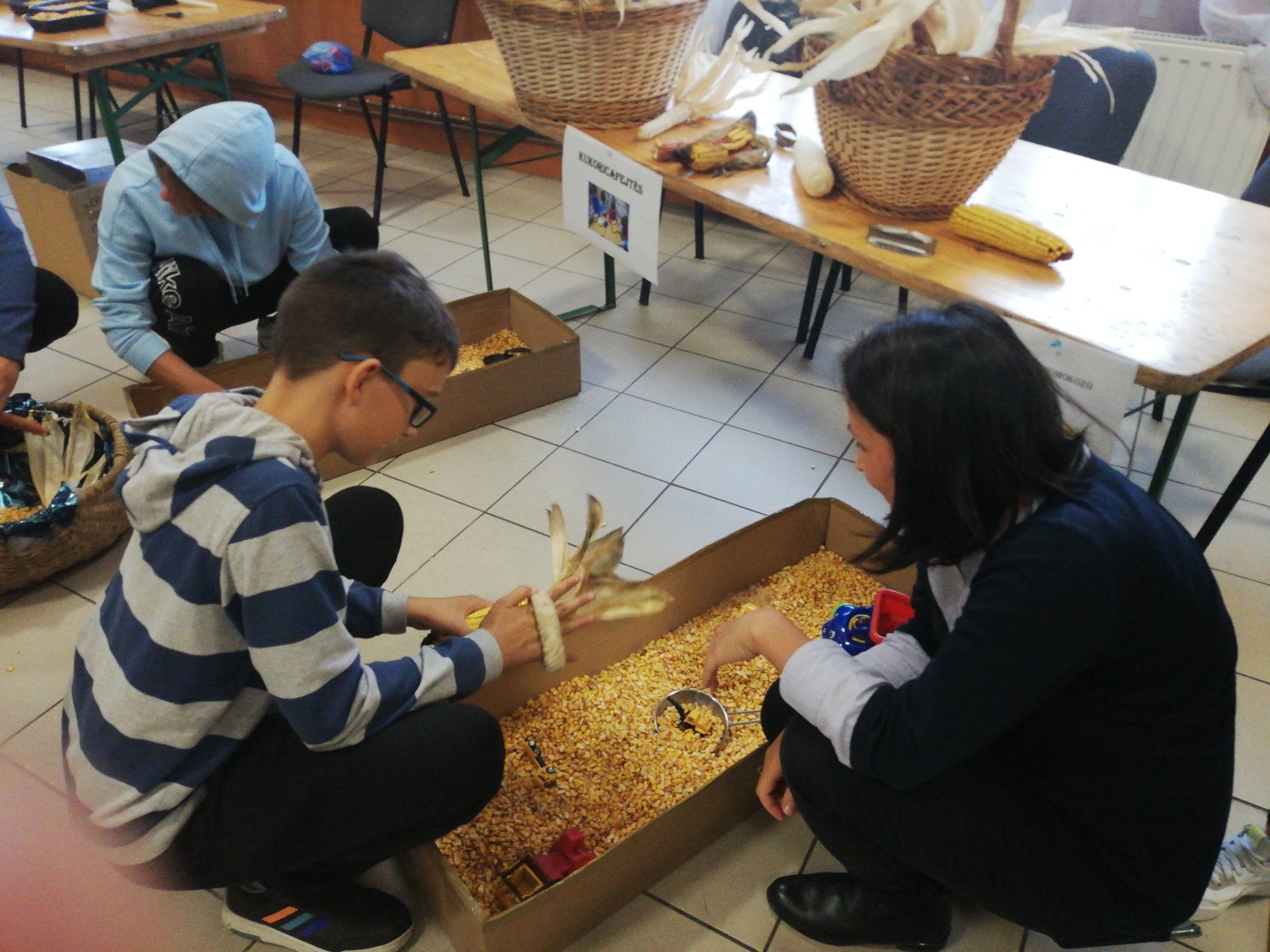A belépőt az ősz hangulata fogadta mind a nagyszínpadon, mind pedig a teremben körbe elhelyezett asztaloknál, ahol hagyományos, természetbarát tevékenységeken vehettek részt a kisebb és nagyobb gyermekek. Az őszi díszekbe öltöztetett színpad, a töklámpás készítésére váró nagy sárga dísztökök, a kukoricaháncsból készült díszek, virágok az évszak jellegzetes színeit idézték. Az első asztalnál a bodza fás szárából fúrt, faragott népi hangszer, a tutora készítését tanulták az érdeklődő gyermekek, akikhez szívesen társultak az apukák is. Kukoricaszemekkel csillagsakkot játszottak a fiúk, a kislányok inkább a malmozást választották. Volt babzsáktöltés, készítettek zörgőt, összeragasztott műanyag poharakba tett kukoricaszemekkel töltve. Az előre megvarrt figurákat nem babbal, ezúttal kukoricaszemekkel töltötték. A kislányok szívesen készítettek kukoricaháncsból virágot, ragasztottak kukoricaszemekből dísztárgyat. Amikor a töklámpafaragás nehezen ment, az anyukák és apukák is besegítettek.