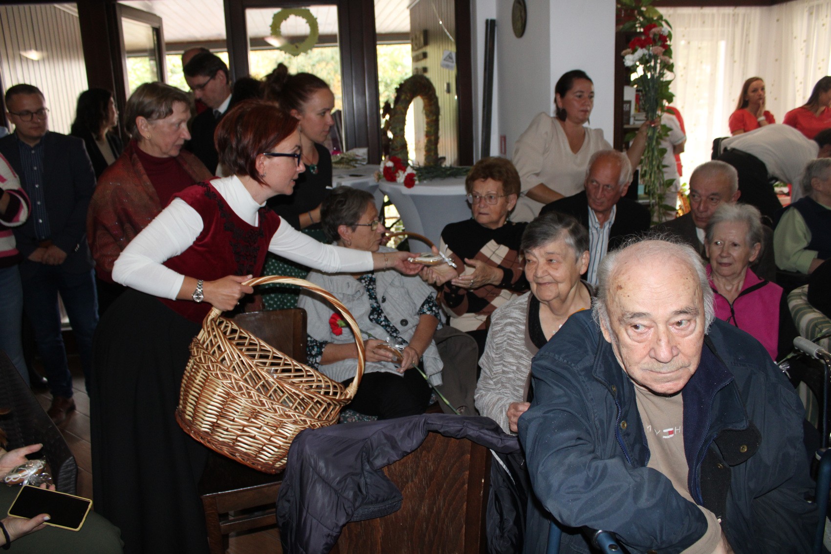 Virággal és az alkalomra készített mézeskalács plakettel köszöntötték az időseket, az otthonban dolgozókat, köztük dr. Finna Juditot, aki az otthon lakóinak orvosi ellátását biztosítja. Végezetül a svédasztalos fogadáson a 94 éves Bende Magdi néni, az otthon legidősebb lakója felvágta az ünnepi tortát.