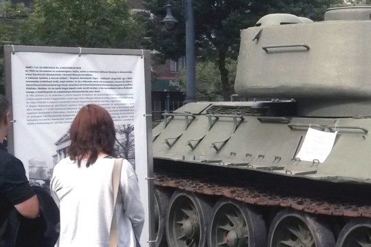 T34-es harckocsi a Magyar Nemzeti Múzeum előterében. Az Arany János-szobor mellett látható tank ágyú...