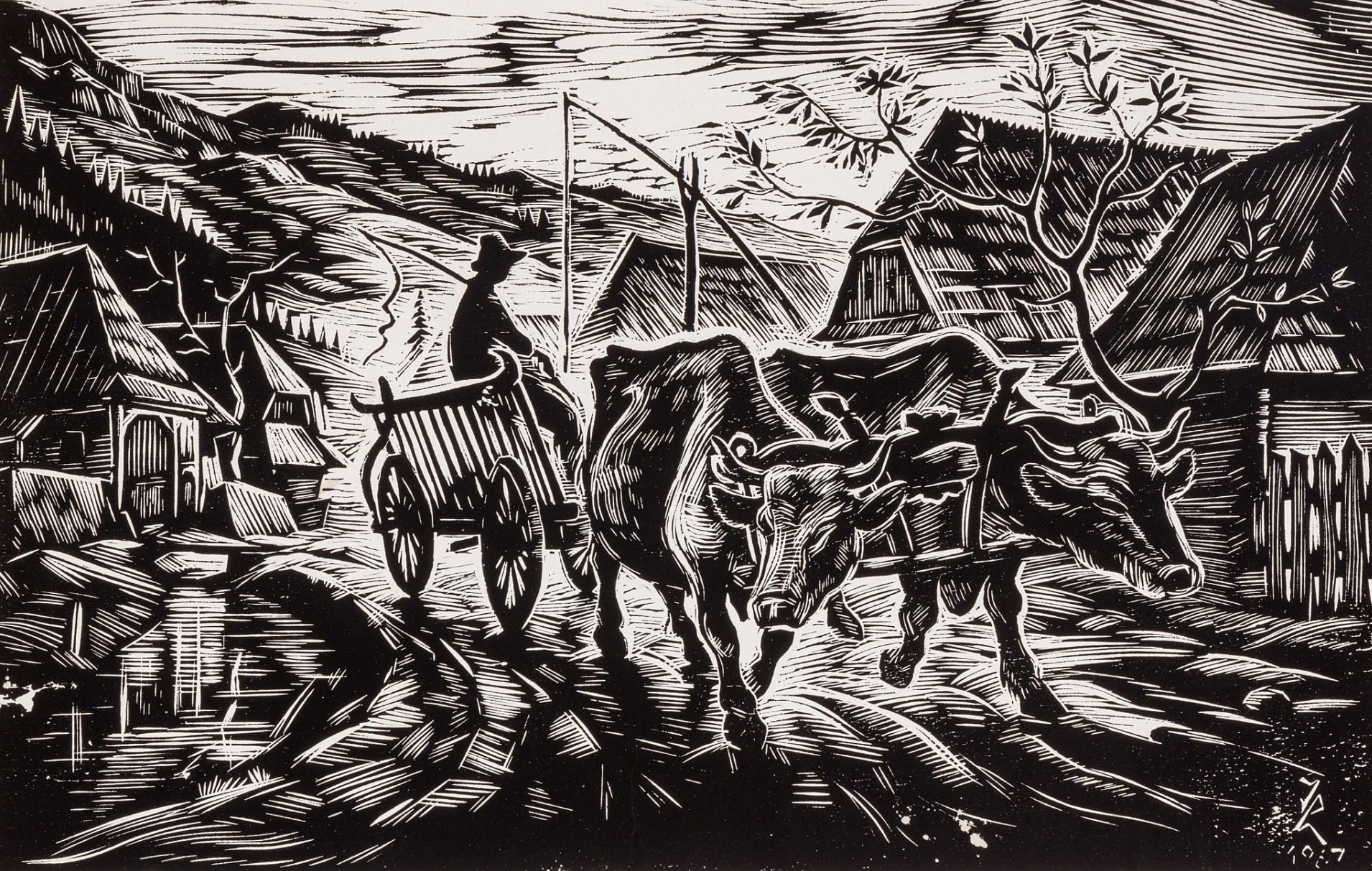 Hajnalhasadáskor térünk vissza a Földre. Mintha Ökörfogat vonszolná az égre a lassan kelő Napot. Mint az 1934. március 13-án Csíkszeredában született Imets László fametszetén. A fény útjába csak a gémeskút sziluettje merészkedik. De nem tudja megakadályozni, hogy az árok békés, szabadon csordogáló vizében megcsusszanjon az első napsugár.