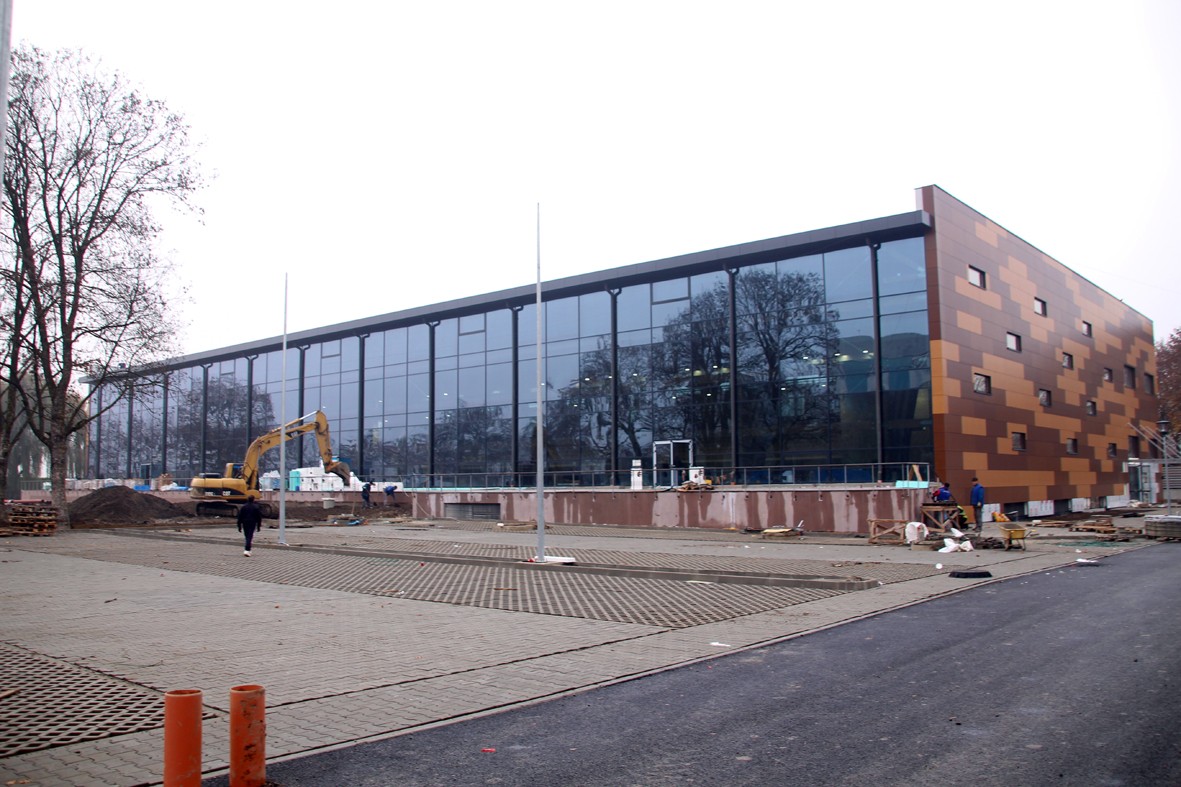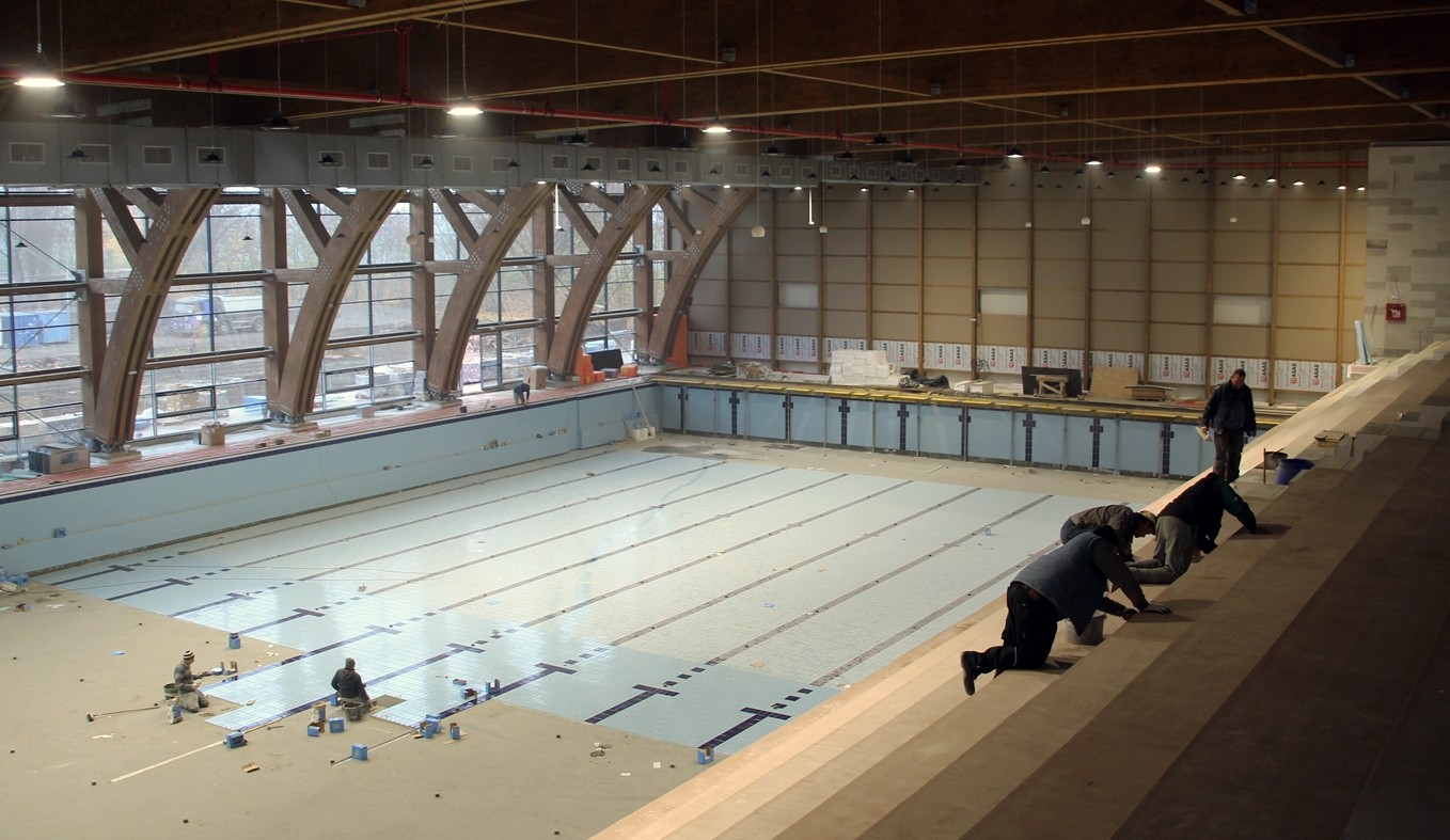 Ottjártunkkor csempézték a lelátók, a medence és a külső erkély padlózatát, bővítették a már meglévő parkolóhelyeket. Következik többek között a villamos hálózat bekötése, az álmennyezetek kiépítése, a belső vakolás. Kint a parkolóhelyek kialakításán dolgoznak, és hozzáfogtak az építkezés miatt megszüntetett, ám az egyezség alapján ugyanolyan méretben visszaállítandó görkorcsolyapálya alapozásához.
