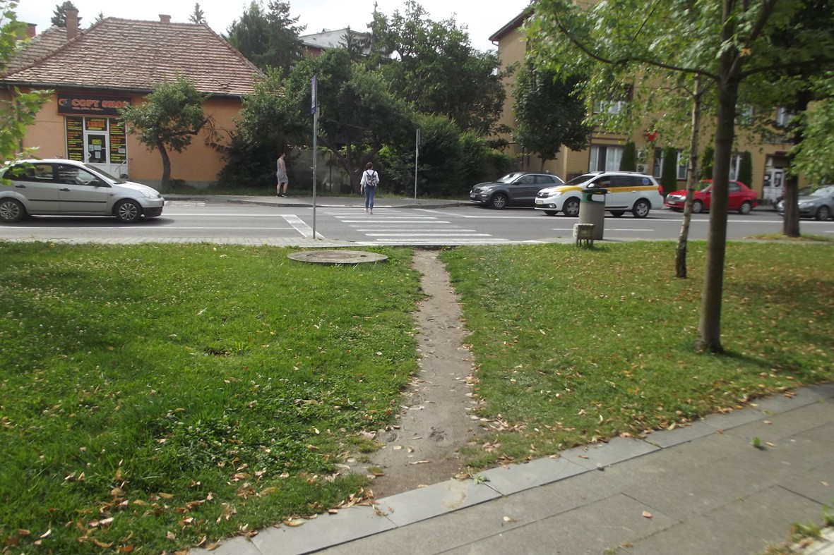 A néhány árnyi terület „úthálózata” sem túl praktikus, ez abból is látszik, hogy a konok gyalogosok igazítottak egyet a tervező elképzelésén. A buszmegálló melletti zebrán átjőve nem kerülgetik a szigeteket, sziklákat és egyéb tereptárgyakat, hanem „toronyiránt” átvágnak a gyepen. Európa észsze-