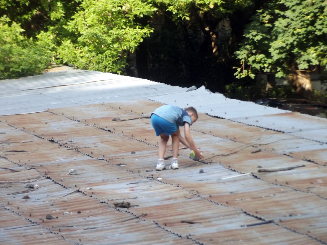 A másik fotó azt illusztrálja, hogy a garázs tetejére rúgott labda elakad valamiben, s a csemete felmászik a hullámlemezekkel borított tetőre, hogy visszaszerezze a „lasztit”. Csoda, hogy a vékony és rozsdás lemez még nem szakadt be egyikük alatt sem!