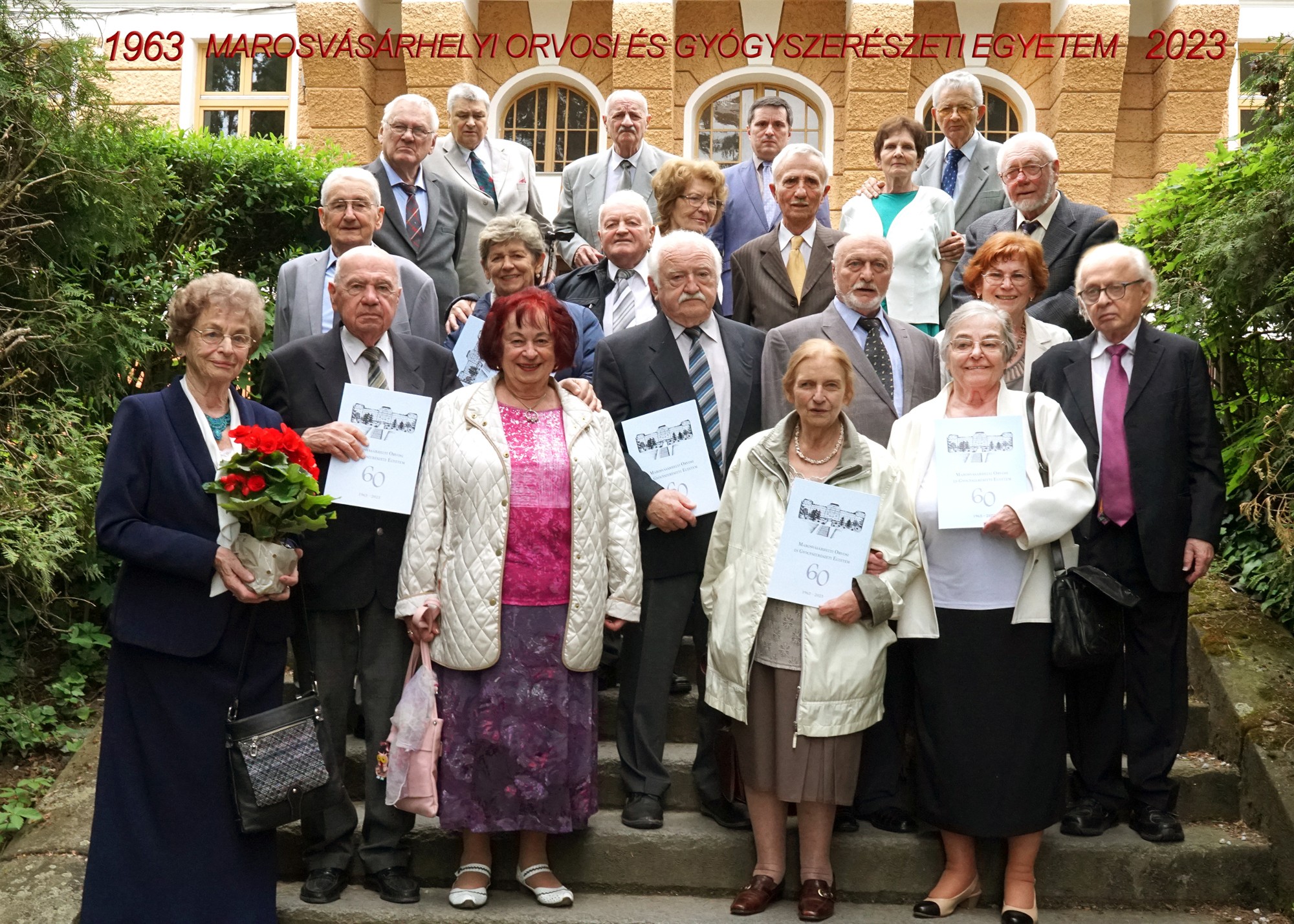 Az 1963-ban Vásárhelyen végzett orvosok hatvanéves találkozóját nem az egyetem szervezte meg, mert a mai intézet hivatalosan nem tekinti sajátjainak az egykori magyar orvostanoda végzettjeit, így aztán segíts magadon, Isten is megsegít alapon önmagunknak szerveztük meg azt. A találkozó hivatalos része május 20-án az egyetem egyik kis termében esett meg dr. Nagy Előd prorektor úr szívélyes közreműködésével. Volt ott mosolygós, vidám beszélgetés és visszatekintés a múltba, itt-ott még dicsekvés is, és volt szomorú megemlékezés az elhunyt 42 társra és a nagyra becsült tanárainkra. Felcsendült a Gaudeamus, amit 60 évvel azelőtt, az egyetem végzésekor egy gonosz ember gonosz indulataiért nem énekelhettünk el. Megtörtént aztán az orvosi és gerontológiai díszbeszéd, végül pedig minden, még élő, ‘63-ban végzett orvos, az otthon maradtak is, gyémántdiplomát kapott az emberiség szolgálatában eltöltött 60 évért. A diplomákat a prorektor úr adta át kedves szavakkal és gratulációval. A kitüntetettek és a jelen lévő családtagok is elérzékenyültek, hiszen különleges alkalom egy ilyen esemény az arra érdemesült ember életében. Távozáskor hagyományos csoportkép készült az egyetemhez felkapaszkodó lépcsőkön, de vagy mi voltunk kevesebben, vagy a lépcső lett nagyobb, mert távolról sem volt már annyira tele, mint a régebbi találkozók képein. Visszanéztünk aztán még egyszer a régi tanodánkra, mely már fájóan idegen nekünk, a mi régi egyetemünk messze úszik már valahol az idők ködös tengerén. Az egykori képe azonban a szívünkbe és lelkünkbe van zárva, mint rovar a borostyánkőbe, azt elvenni tőlünk már nem lehet.