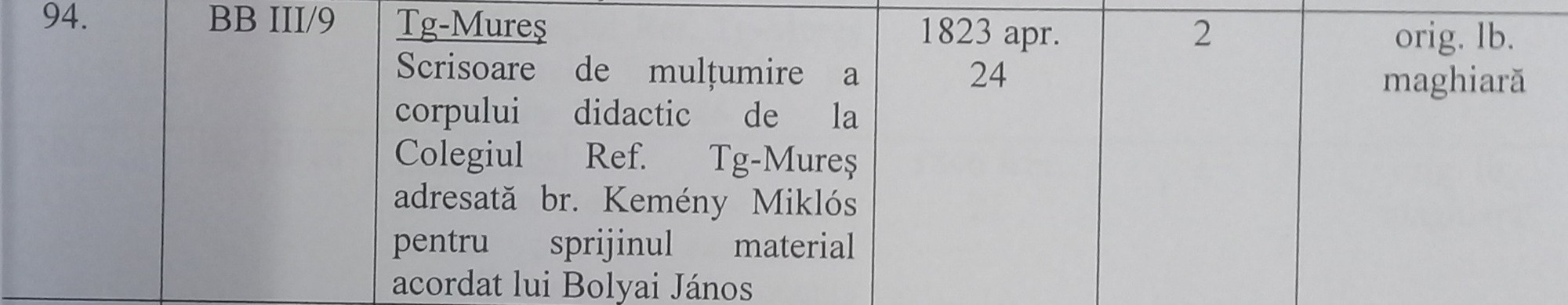 Az tény, hogy magyargyerőmonostori gróf Kemény Miklós fedezte Bolyai János tanítási költségeit a bécsi katonai akadémián, ami közel 8000 rénes forintba került (az akkori viszonyok között egy marosvásárhelyi központi kőház ára). Kérdés, hogy a református kollégium adminisztratív iratokat tartalmazó fondjában, a Nemzeti Levéltár Marosvásárhelyi Fiókjában megvan-e a levél, csak a katalóguskészítő szakember elnézte a leltár összeállításakor, vagy időközben a köszönőlevél elveszett?