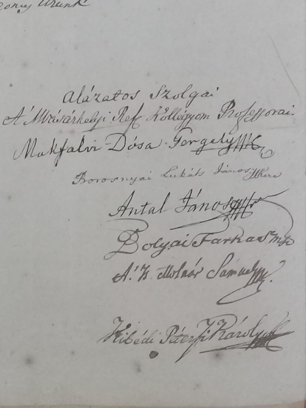 Nos, a levél azért is érdekes, mert az aláírók is kiváló, híres professzorai voltak a református kollégiumnak. Molnár Sámuelen és Péterfi Károlyon kívül mind tanították Bolyai Jánost is. (1823-ban Köteles Sámuel már Nagyenyeden tanított, és helyette jött Péterfi Károly.) Érdekesnek tartom megemlíteni kibédi Péterfi Károlyt, aki a szépapja volt Péterfy Gergely írónak és Péterfy Bori énekesnőnek, Jékely Zoltán unokáinak. Későbben Péterfi Károlyt a Tudós Társaság (az MTA jogelődje) levelező tagjai sorába választotta.