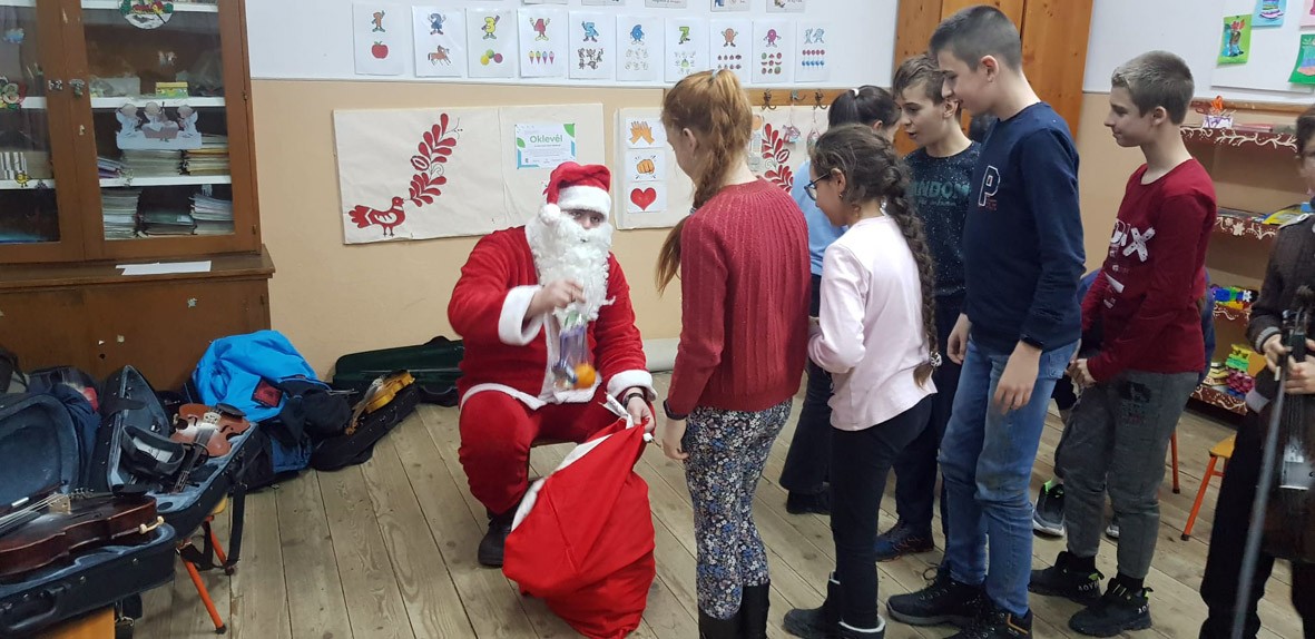 Illyésmezőben a hangszerekkel ismerkedő gyerekeket lepte meg az ajándékosztogató öregapó