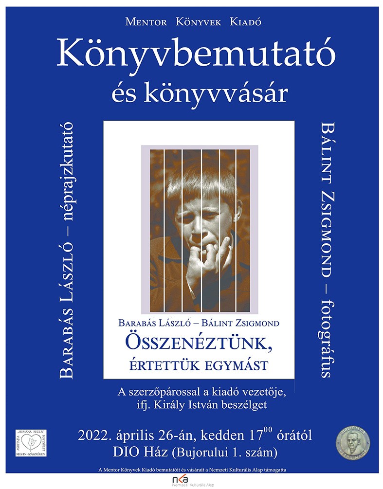 Április 26-án, kedden 17 órától a szászrégeni DIO Házban bemutatják Barabás László néprajzkutató és Bálint Zsigmond fotográfus Összenéztünk, értettük egymást című, közösen kiadott könyvét. Az erdélyi magyarság, főként a közép-erdélyi régió népi közösségének múlt századi szokásairól szóló, fotókkal gazdagon illusztrált kötetet méltatja, majd a szerzőkkel beszélget ifj. Király István, a Mentor Könyvek Kiadó vezetője. Szervező a Humana Regun Egyesület és a Petru Maior városi könyvtár.