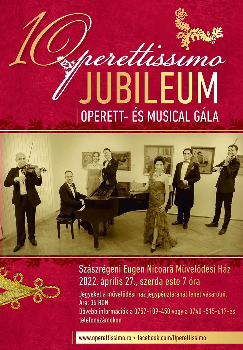 Április 27-én, szerdán 19 órától a szászrégeni Eugen Nicoară művelődési ház nagytermében vendégszerepel a kolozsvári Operettissimo együttes. Jubileumi operett- és musical-előadásukban fellépnek Kolcsár Katalin, Székely Zsejke, Rigmányi István és Plesa Róbert énekesek, hegedül Deák Albert és Gyenge Zoltán Balázs, zongorázik Kolcsár Péter. Az érdeklődők a belépőt a művelődési ház jegypénztáránál vásárolhatják meg munkanapokon 9 és 17 óra között, helyfoglalás a 0757-109-450 és a 0740-515-617 telefonszámokon is.