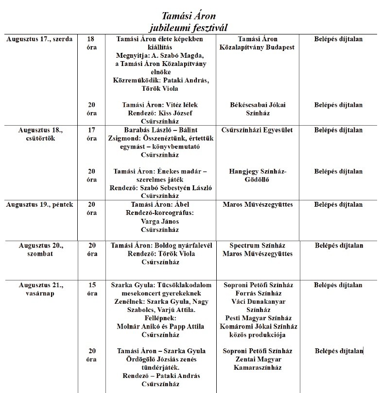 Augusztus 17–21. között a mikházi Csűrszínházban, a székely író halálának 125. évfordulója alkalmából rendezvénysorozatra kerül sor. A Békéscsabai Jókai Színház a Vitéz lélek című előadást, a gödöllői Hangjegy színház az Énekes madarat viszi színre, a Maros Művészegyüttes az Ábel táncszínházi produkciójával és a Spectrum Színházzal közösen színpadra állított Boldog nyárfalevél című előadással lép fel, a Soproni Petőfi Színház, a Forrás Színház, a Váci Dunakanyar Színház, a Pesti Magyar Színház és a Komáromi Jókai Színház közös produkciójaként látható, hallható Szarka Gyula Tücsöklakodalom mesekoncertje. A Soproni Petőfi Színház, Zentai Magyar Kamaraszínház elhozza Mikházára az Ördögölő Józsiás című zenés tündérjátékát. Az eseményt és a Tamási Áron életéről szóló kiállítást megnyitja A. Szabó Magda, a Tamási Áron 125 Emlékév Budapest projektvezetője, közreműködik Pataki András és Török Viola. A program követhető a www.csurszinhaz.ro honlapon és a Csűrszínház Facebook-oldalán.