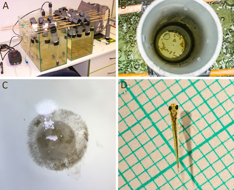 A. A keltetéshez használt vizes tank. B. A keltetéshez használt PVC-cső felülnézetből, az alján látszanak az ikrák. C. Egy gombás fertőzés áldozatául esett ikra. D. Egy kacsán átjutott és kikelt pontyivadék körülbelül négyhetes korában.