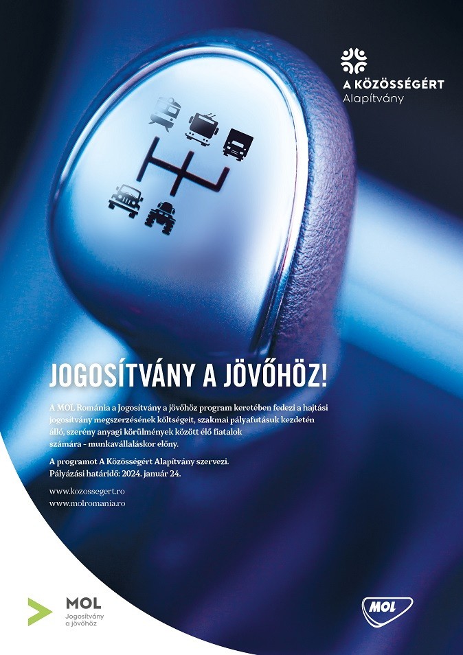 A Közösségért Alapítvány kilencedik alkalommal szervezi a Jogosítvány a jövőhöz! programot a MOL Románia finanszírozásával. A program anyagi támogatást biztosít 18-25 éves, hátrányos helyzetű fiatalok részére. A pályázatok benyújtásának határideje: 2024. január 24.