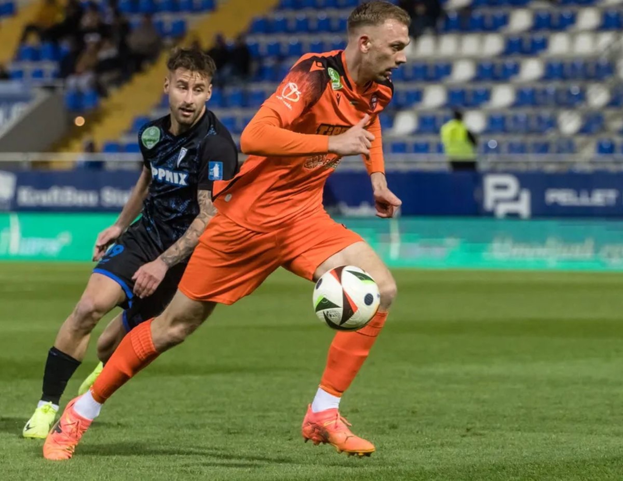 Nyíri Vince, a Zalaegerszegi TE (b) és Keresztes Krisztián, a Nyíregyháza Spartacus játékosa a labdarúgó MOL Magyar Kupa negyeddöntőjében játszott Zalaegerszegi TE FC – Nyíregyháza Spartacus FC mérkőzésen a zalaegerszegi ZTE Arénában 2025. április 1-jén. Fotó: MTI/Katona Tibor