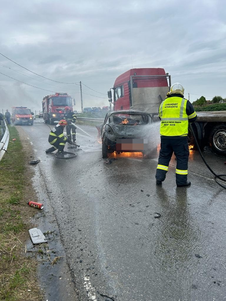 Május 4-én 14 óra körül a dicsőszentmártoni tűzoltóságot, a balázsfalvi vészhelyzeti egységet és a balázsfalvi önkéntes tűzoltókat is riasztották a közúti baleset helyszínére. Az ütközés nyomán kigyulladt személyautóban rekedt a jármű vezetője, egy 40-50 év közötti férfi. A járműbe szorult személyt a helyszínen tartózkodók szabadították ki a járműből. Az autóból kihúzott áldozatot átvette a mentőegység. A teherautó vezetője nem szorult orvosi ellátásra – tájékoztatott Oltean Georgiana, a Maros megyei tűzoltóság szóvivője.