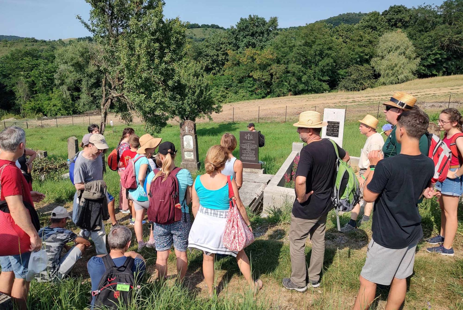 A kánikula sem riasztotta vissza a táborlakókat a jókora kirándulástól: első megállójuk a temetőben, Balla Antal sírjánál volt, ahol egyperces néma főhajtással és imával emlékeztek az egykori néptanácstitkárra, népművelőre, tánckarvezetőre.