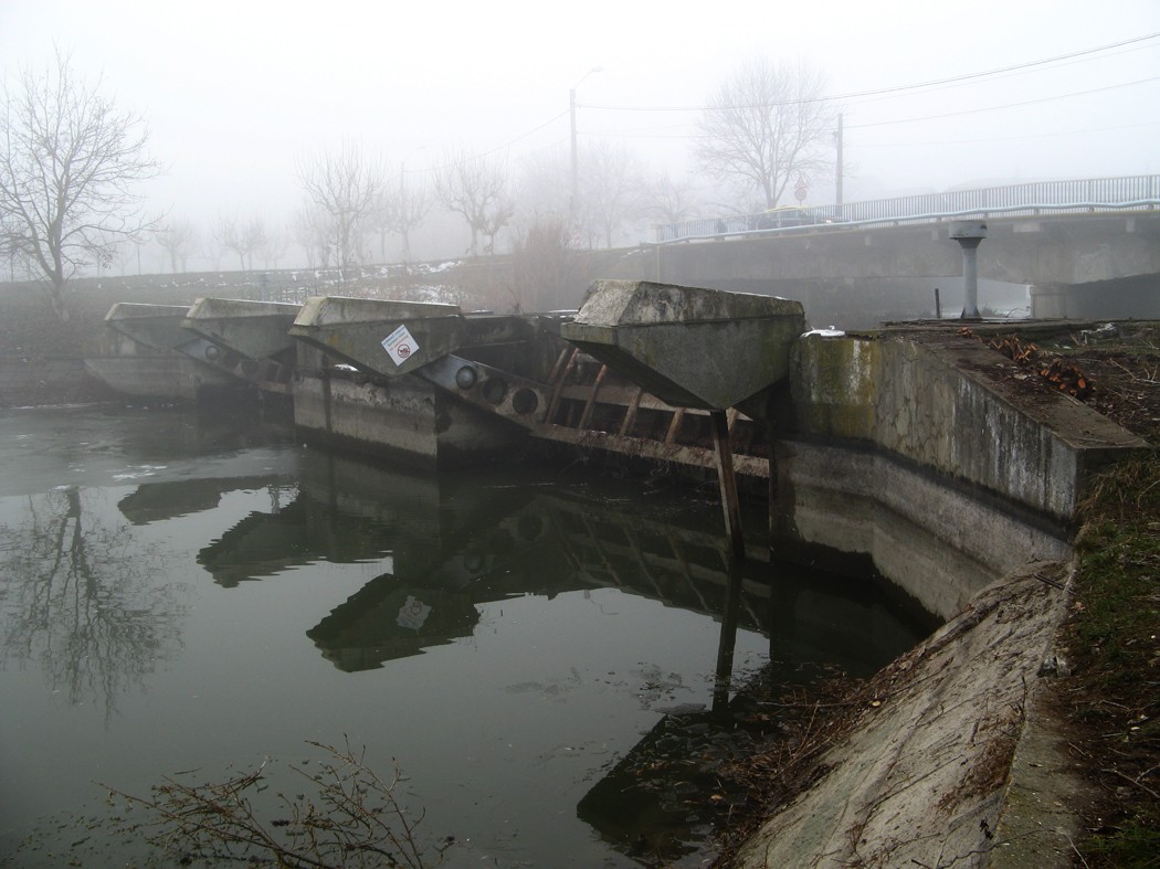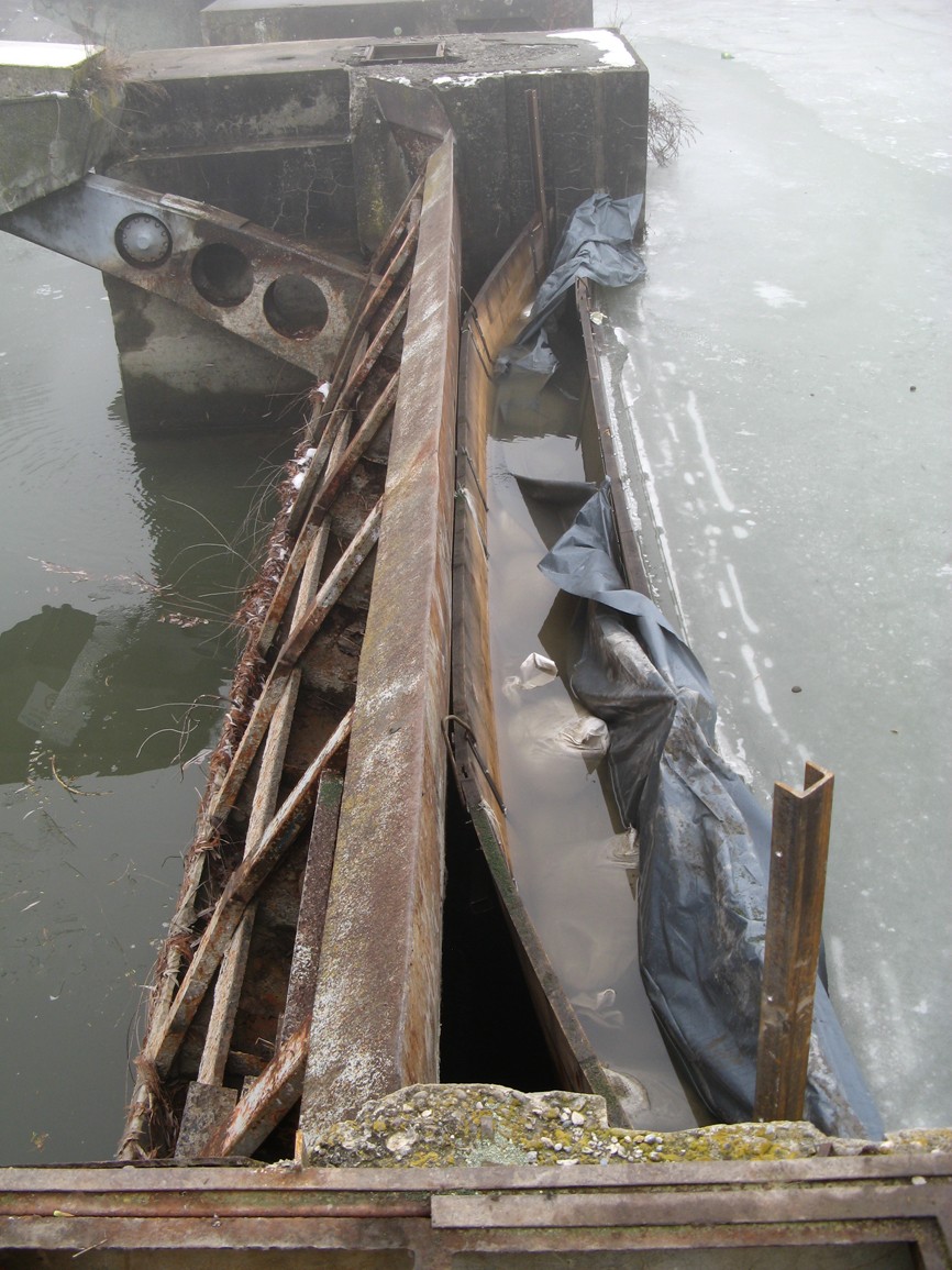 A szezonon kívüli időszakban a zsilipek zárva voltak, hogy a tavat karbantartás céljából le lehessen üríteni az ezek kétoldali zárótömbjébe szerelt ürítőberendezések segítségével a Maros gát alatti medrébe a Turbina-árok alatt átvezetett Csónakos (Luntraşilor) utcai esővízcsatornán keresztül. A rendszeres karbantartás elmulasztása a zsilipek acélszerkezetének egyre nagyobb mértékű rozsdásodását, a fogaskerekes működtető mű károsodását és az ürítőrendszer tönkremenetelét eredményezte. A rozsdásodás a zsilipeket erősen meggyengítette, továbbá a homloklemezek kilyukadása az évtizedek alatt megévődött gumitömítésekkel együtt azok vízzáróságát is kompromittálta, miáltal a vízveszteség állandósult és egyre nagyobb méreteket öltött. Ez a romlás 2011-ben már a hivatalt is felébresztette, és szeptember-októberben foltozgatni kezdett. Úgy-ahogy letisztították a rozsda egy részét, kicserélték a homloklemezeket és néhány merevítést, és lefestették a szerkezetet. Nem nagy túlzás, ha azt mondjuk, hogy majdnem a festék tartotta csak össze a szerkezetet. Ennyi volt a nagyjavítás. Akkor már a laikus is láthatta, hogy ez távolról sem elég, és ennek jó vége nem lesz. Ez a pillanat el is érkezett ez év novemberében, amikor a hivatal a gát által duzzasztott vízszint csökkentését kérte. A mellékelt két kép egyikén a hivatal zseniális megoldása látható, amellyel a vízveszteséget próbálja csökkenteni a bal oldali zsilipnél. Ezúttal a Maros felőli vízbeáramlást. Az észvesztő megoldás a zsilip előtti hornyokba illeszteni próbált két vékony vaslemezre feszített műanyag fóliából áll. Látható, hogy a fólia középen már le is csúszott, a belső vaslemez pedig gyengeségének tudatában és szégyenében beroggyant (december 11-i délelőtti állapot). Amint a látottak és a hely hiányában nem mellékelt fényképek tanúsítják, a majd’ szitává rozsdásodott szerkezeten és a tönkrement gumiszigetelésen keresztül a Marosból több helyen is beszivárog a víz, lassan, de biztosan feltöltve a tómedret. A másik képen nem kevesebbet látunk, mint hogy a zsilipet a partoldali ellensúly alatt egy acélcölöppel kitámasztották! Ez pedig azt bizonyítja, hogy a szerkezet a fogaskerekes művel együtt a teljes összeroppanás előtt áll. Gondolom, most már értelmet kap a cikk elején a hivatal által emlegetett „kisebb nyomás” igénye. Nyitott kérdés, hogy ki fog felelni mindezért a minősíthetetlen hozzáállásért.