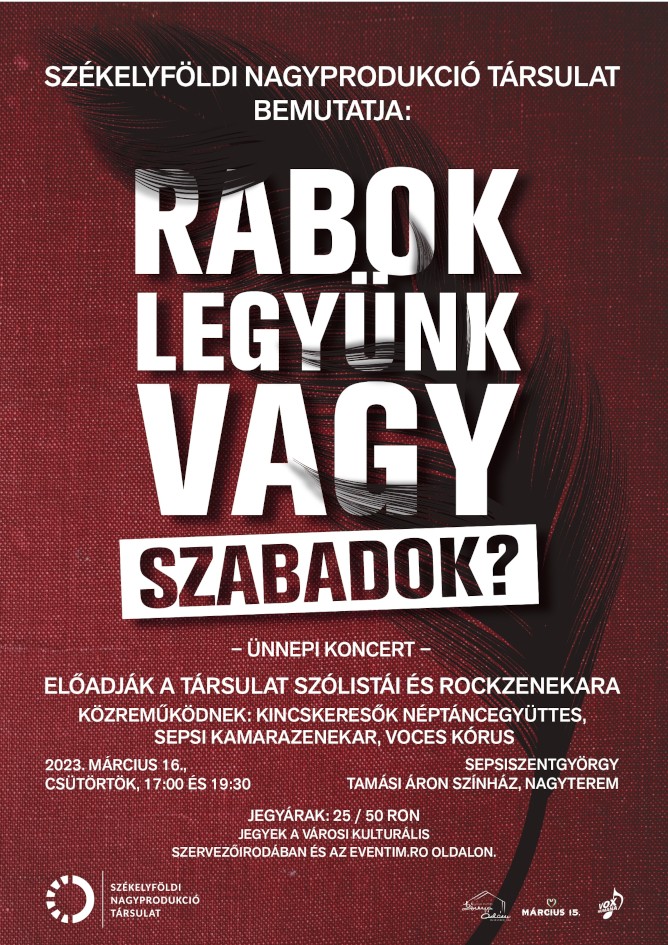 A Székelyföldi Nagyprodukció Társulat első előadása március 15-e szellemében készül. A különleges zenei előadást a sepsiszentgyörgyi Tamási Áron Színház nagytermében tartják március 16-án, csütörtökön 17.00 és 19.30 órától. A nagy sikerű István, a király székelyföldi nagyprodukció szólistáiból és zenekari tagjaiból verbuválódott társulat a Rabok legyünk vagy szabadok című, nagyszabású zenés és verses összeállítással tiszteleg a magyar hősök előtt, mely méltó zárása lesz az idei sepsiszentgyörgyi március 15-i rendezvénysorozatnak.