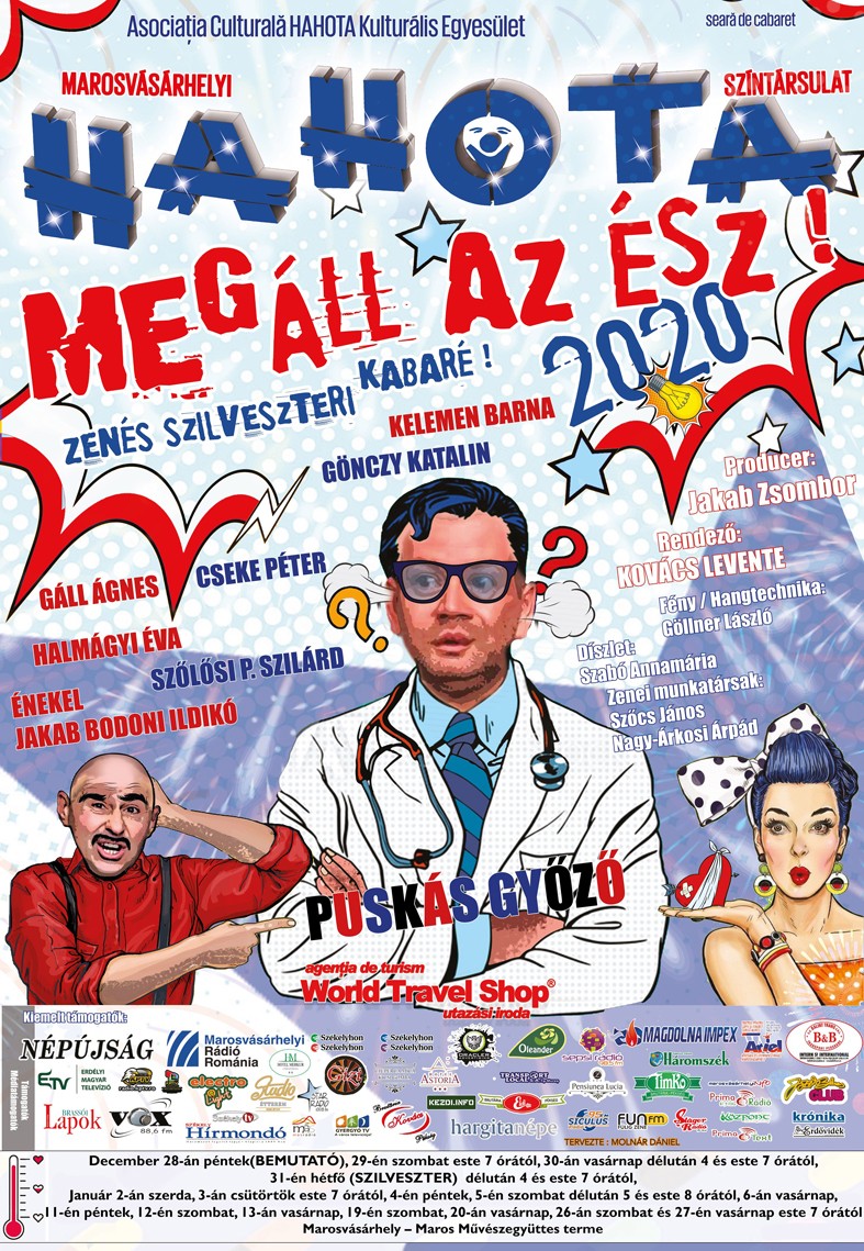 A Hahota színtársulat december 28-án, szombaton este 7 órától mutatja be a Megáll az ész! című szilveszteri kabaré-előadását Marosvásárhelyen, a Maros Művészegyüttes előadótermében. További decemberi előadások: 29-én, vasárnap este 7 óra, 30-án, hétfőn du. 4 és este 7 óra, valamint 31-én, kedden du. 4 és este 7 óra. Szovátán január 6-án és 7-én este 7 órától a Domokos Kázmér Művelődési Házban, Szászrégenben január 8-án és 9-én este 7 órától az Eugen Nicoară Művelődési Házban vendégszerepel a társulat.