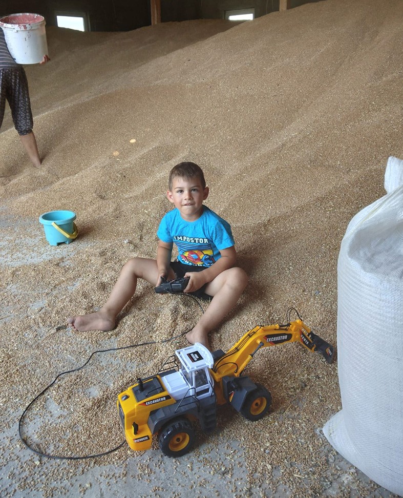 A raktárban tárolt búzát Simona, a feleség mutatta meg, ahol a következő generáció, a kisunoka, Márk irányítható markológépével játszva ismerkedik a mezőgazdasági munkával.