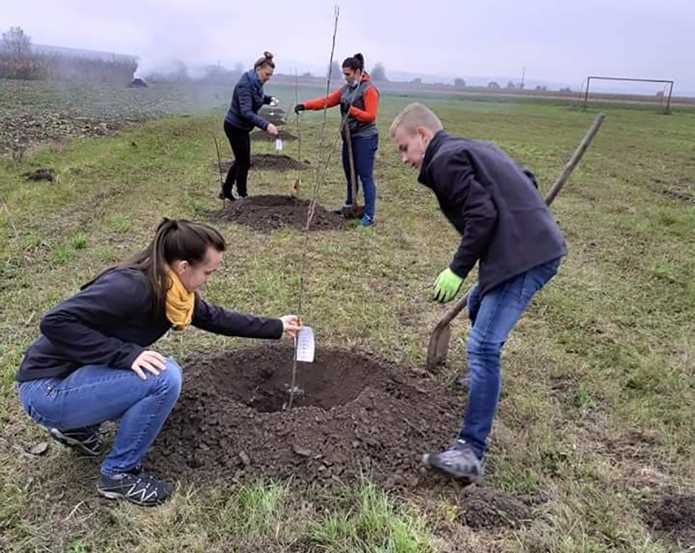A múlt héten az egyesület egy másik közösségi akciót is szervezett: folytatta a tavalyelőtt elkezdett faültetést. Wass Albert művére és üzenetére utalva 2018-ban tizenhárom almafát ültettek el a helyi futballpálya körül. Idén áprilisban szerették volna ezt folytatni, de a járvány miatt akkor nem kerülhetett erre sor, ezért nemrég újra meghirdettek egy jótékonysági gyűjtést Adományozz és ültess egy fát a jövőnkért! címmel. Aki jónak látta és tehette, egy almafacsemete árát fizethette be az egyesülethez – örömükre ez a felhívás is sikerrel járt, 35 csemete ára gyűlt be. A járványügyi szabályozások miatt nem hívhattak meg minden adományozót a fák elültetésére, ezt múlt csütörtökön az egyesületi tagok tették meg. Szándékosan választották ezt a helyet két éve, hiszen ha az önkormányzat a sport mellett egyszer majd akár rendezvény- és közösségi térként is használná a területet, ott az egyesület kezdeményezései is helyet kaphatnak. Az elültetett fákat a szervezet tagjai gondozzák a jövőben, de a csemetéken cetlik hirdetik a fák jelképes tulajdonosait. Minden adományozó egy-egy oklevelet is kapott, amelyen Lénárd Sándor sokatmondó szavait is tolmácsolja az egyesület: „Otthon van az ember, ahol gyökerei vannak, halottai az anyaföldben, ahol tegezik az embert, ahol nagyapja ültette diófának a gyümölcsét töri, és fát ültetve unokáira gondol.”