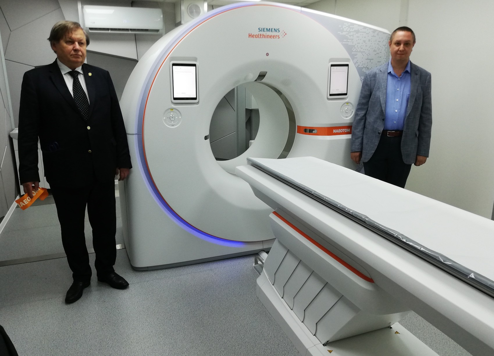 Romániában elsőként Marosvásárhelyen, a Cardiomed orvosi központban avattak fel Naeotom Alpha komputertomográfot. A fotón prof. dr. Benedek Imre, a Cardiomed klinika alapító elnöke és dr. Florin Preoteasa, a Siemens Healthineeres regionális menedzsere Fotó: Bodolai Gyöngyi